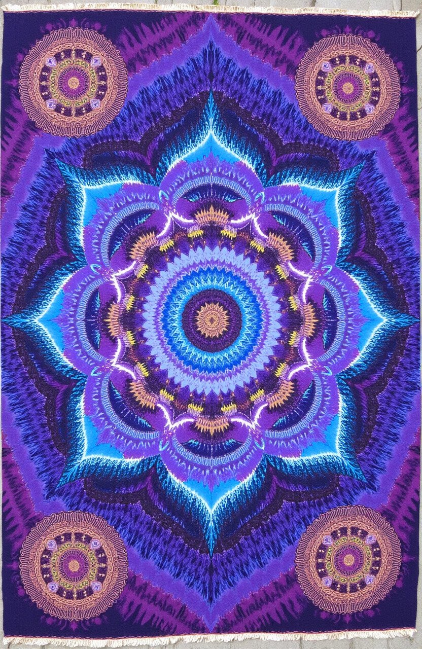 Intricate mandala designs in rich purples and blues adorn this rug. Its spiritual motifs can create a meditative space right in your home.