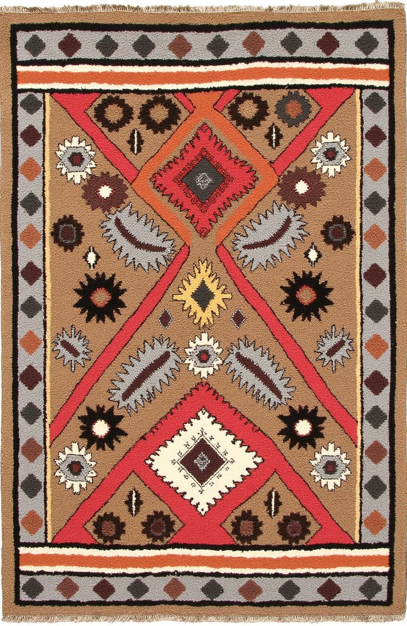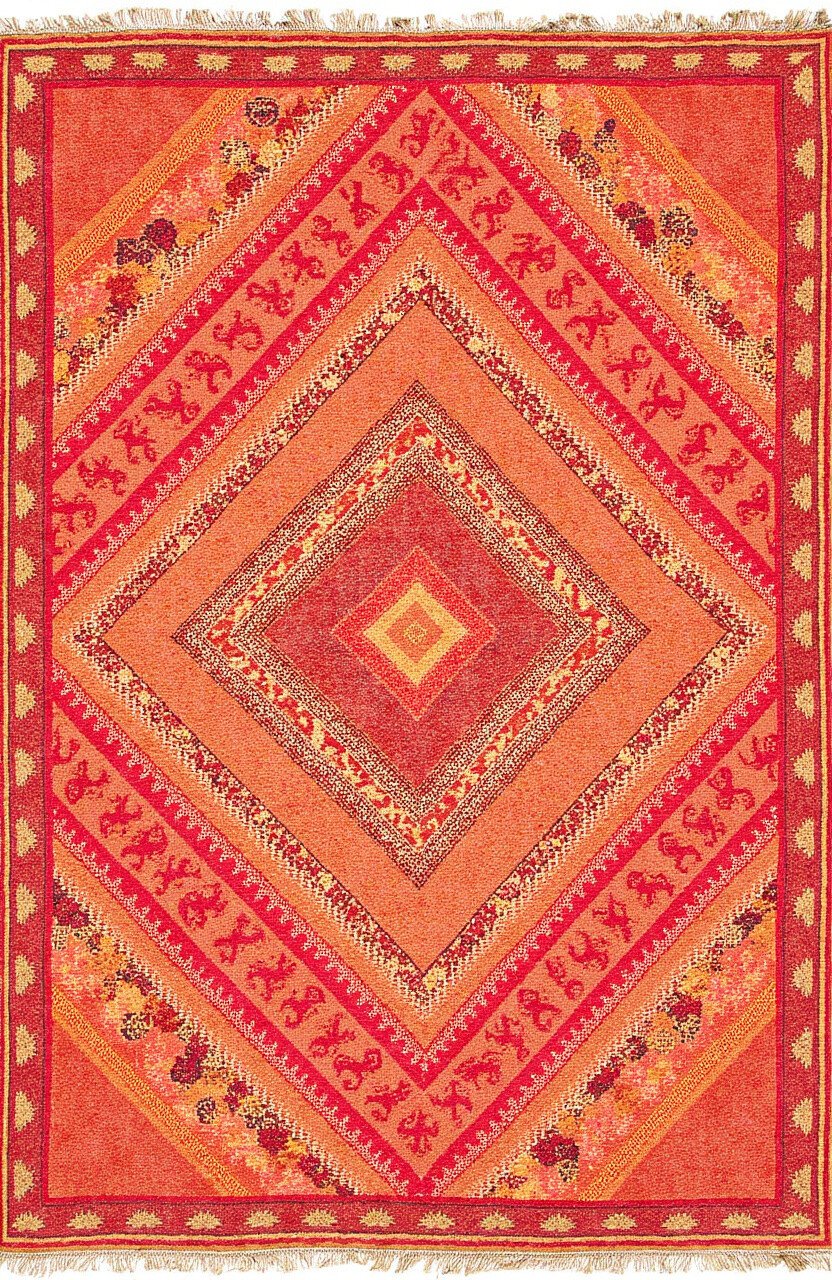 This rug features intricate geometric patterns in vibrant reds and oranges, reminiscent of a bustling Moroccan market. Its design is rich with cultural references.