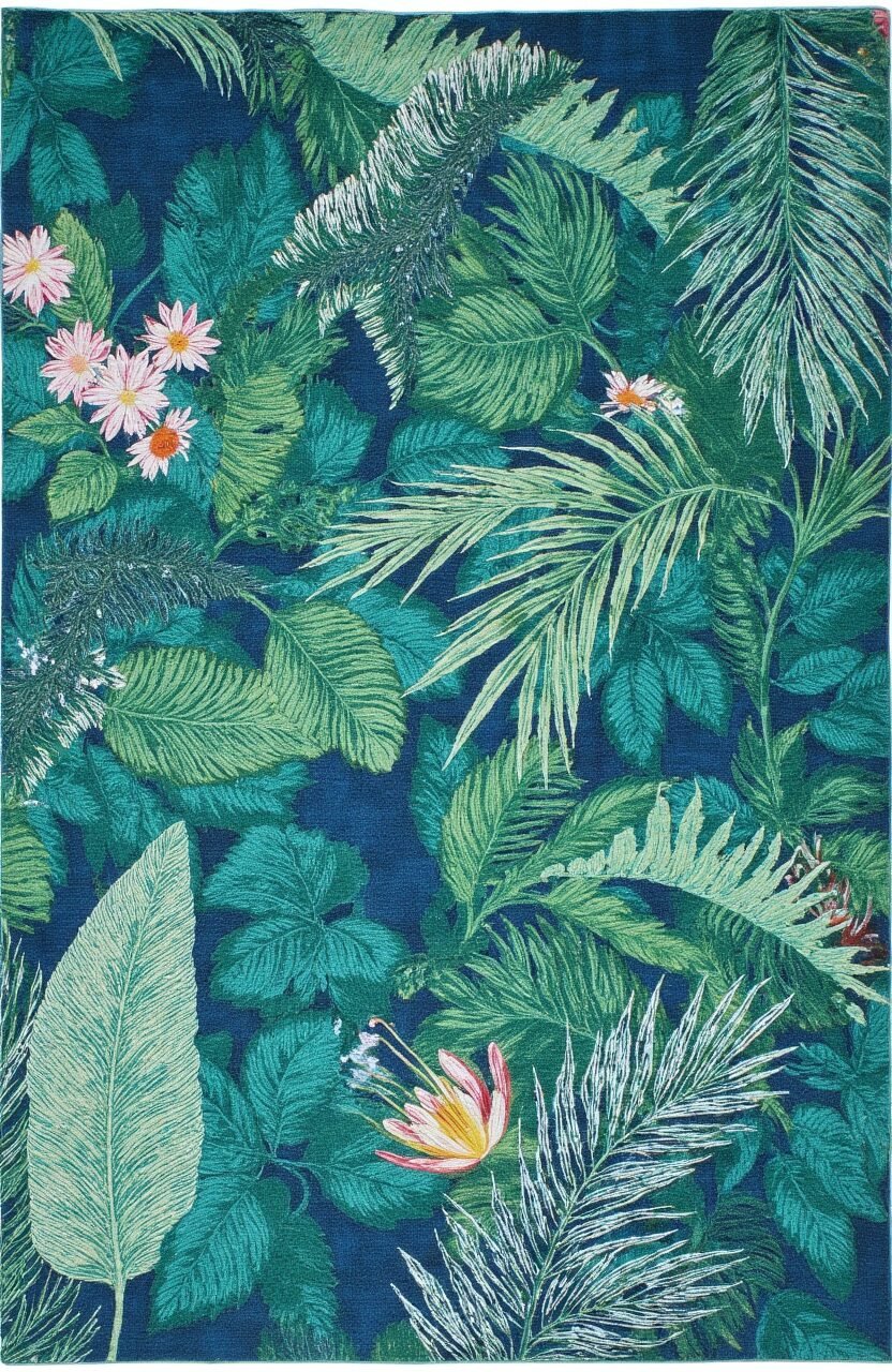 This rug bursts with lush greens and deep blues, reminiscent of a thriving jungle. Its design incorporates leaf patterns and exotic flowers, bringing a slice of paradise into your living room.