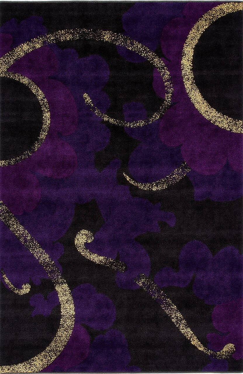 Deep blacks and rich purples come together in this enchanting rug. Swirls of gold add a touch of opulence, making it a stunning centerpiece.