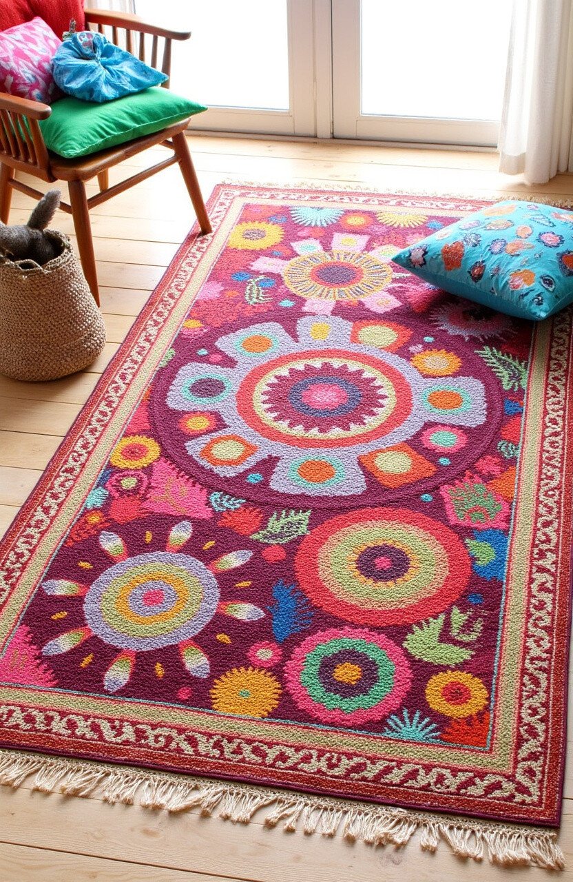 Bright colors and lively patterns make this rug feel like a celebration underfoot. It’s perfect for adding a joyful touch to any room.