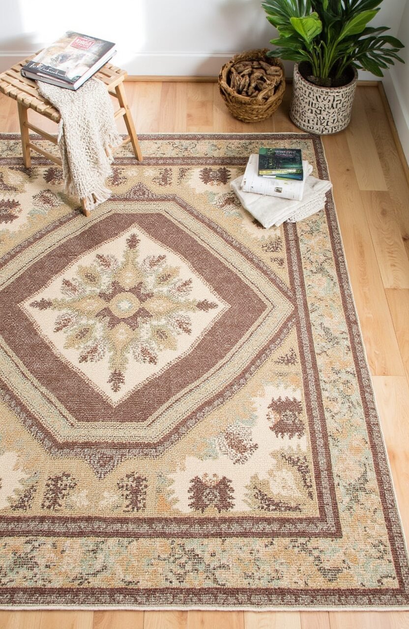 Brown, beige, and green tones merge in this rug, evoking the beauty of a forest floor. The intricate patterns mimic the textures of leaves and bark.