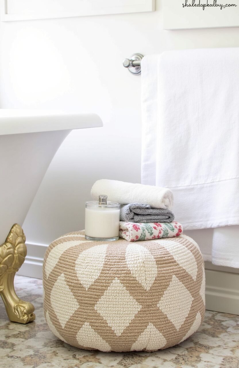 Transform your bathroom into a spa-like retreat with a batik jute pouf. Its texture and design add a touch of luxury to the space.