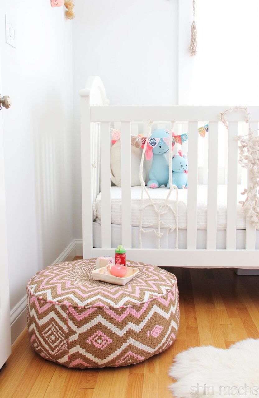 Incorporate a batik jute pouf into your nursery decor. Its soft texture and gentle patterns add warmth and comfort to the room.