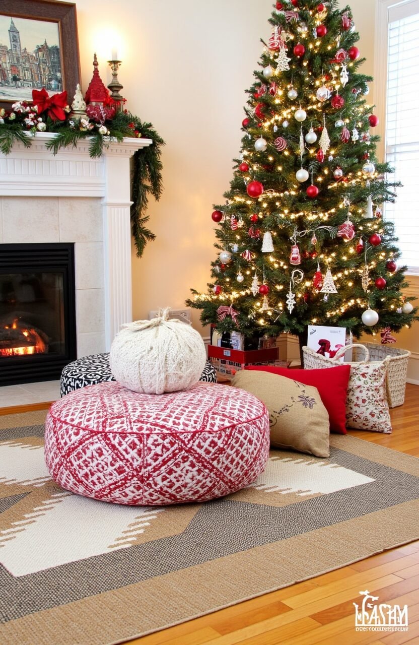 Arrange them around the Christmas tree or fireplace to provide seating for guests. This setup enhances the cozy, welcoming atmosphere of holiday gatherings.