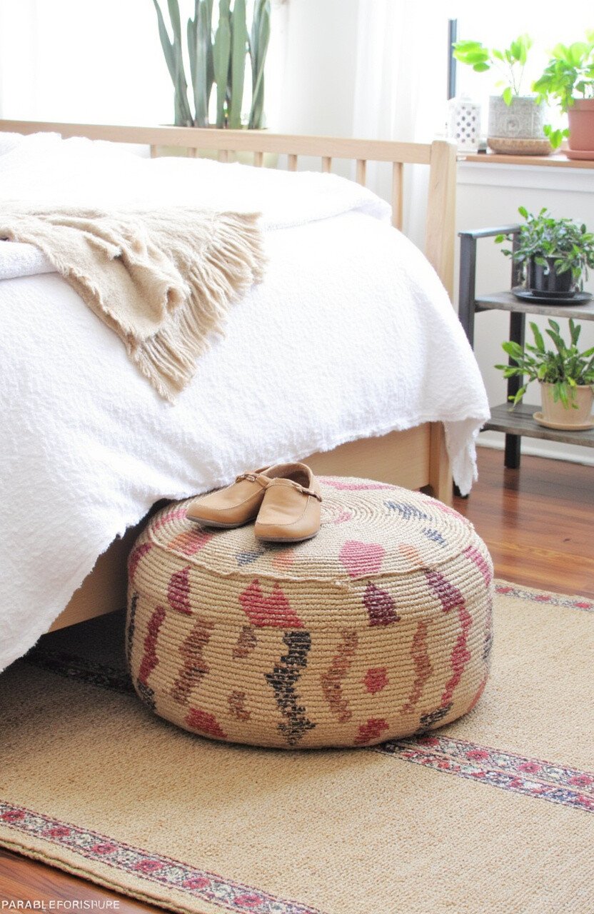Place a batik jute pouf at the foot of your bed to enhance a bohemian style. The organic materials and patterns will harmonize with natural elements like wooden furniture and potted plants.