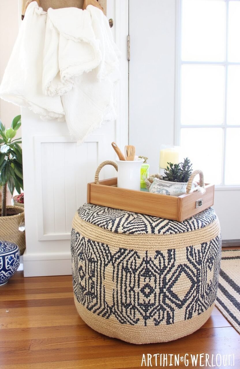 Place a batik jute pouf in your entryway to make a memorable first impression. It’s a practical spot for guests to sit while removing shoes.