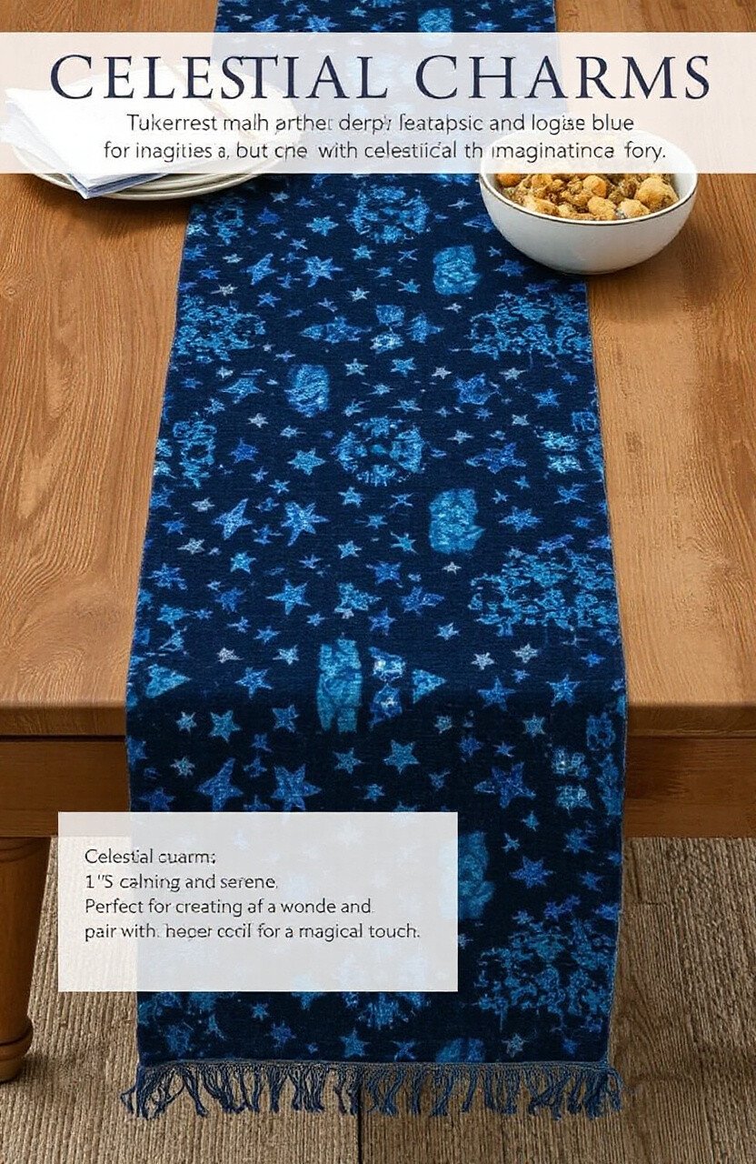 The Celestial Charm runner features deep blues and starry patterns, reminiscent of a night sky. It’s calming and serene.