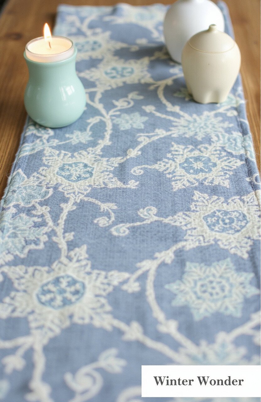 The Winter Wonder runner brings the beauty of winter indoors. Its cool colors and delicate patterns are soothing and serene.