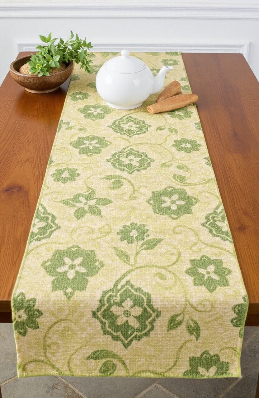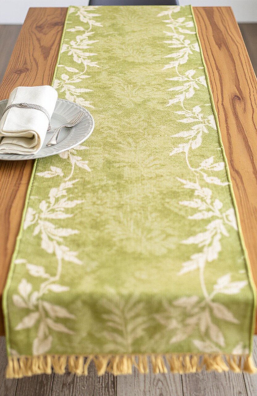 The Meadow Magic runner features soft greens and gentle patterns, reminiscent of a peaceful meadow. It’s calming and serene.