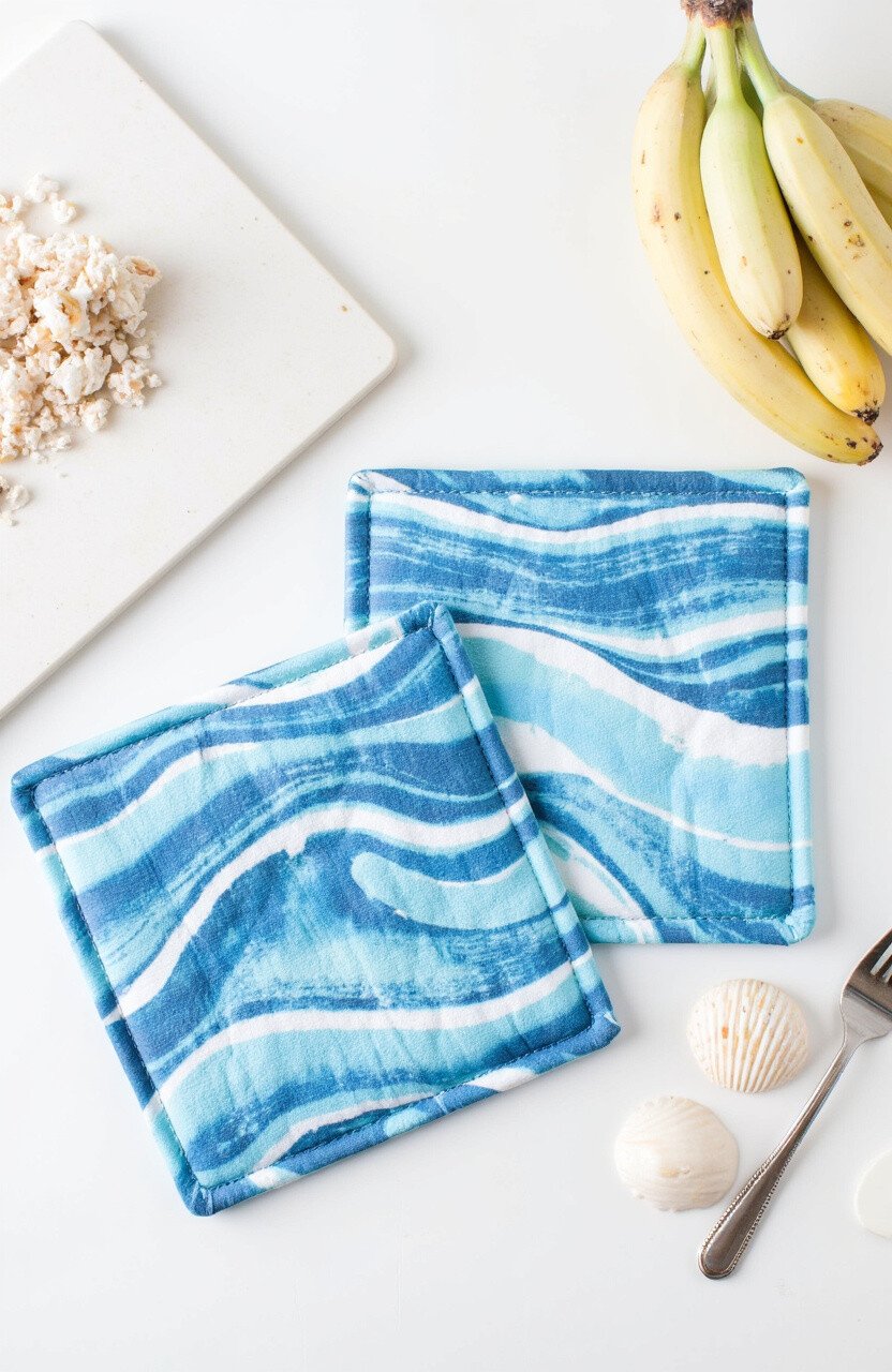 Feel the calm of the ocean with these soothing blue and white pads. They capture the gentle ebb and flow of the sea. Perfect for those who love a serene cooking environment.