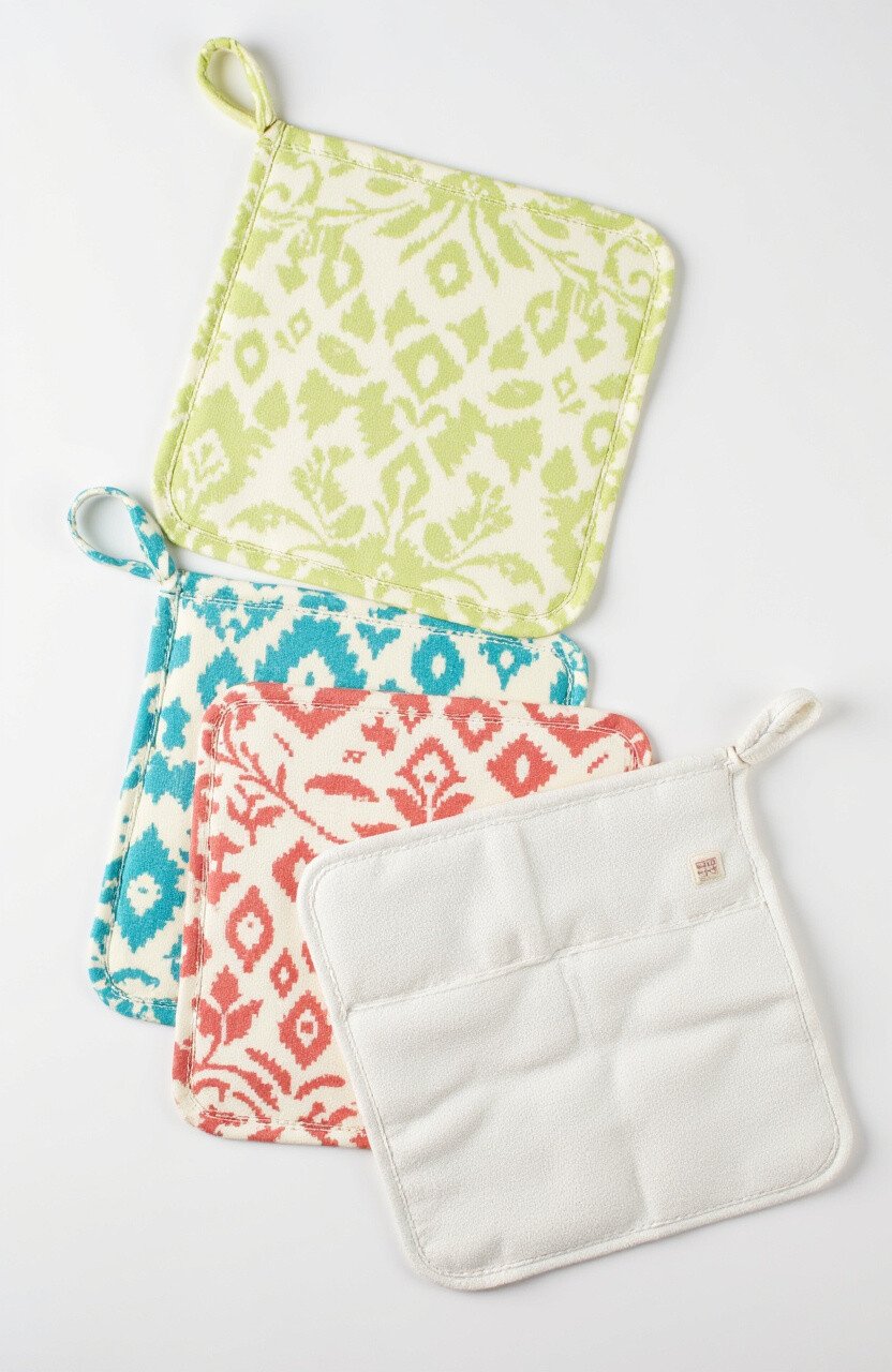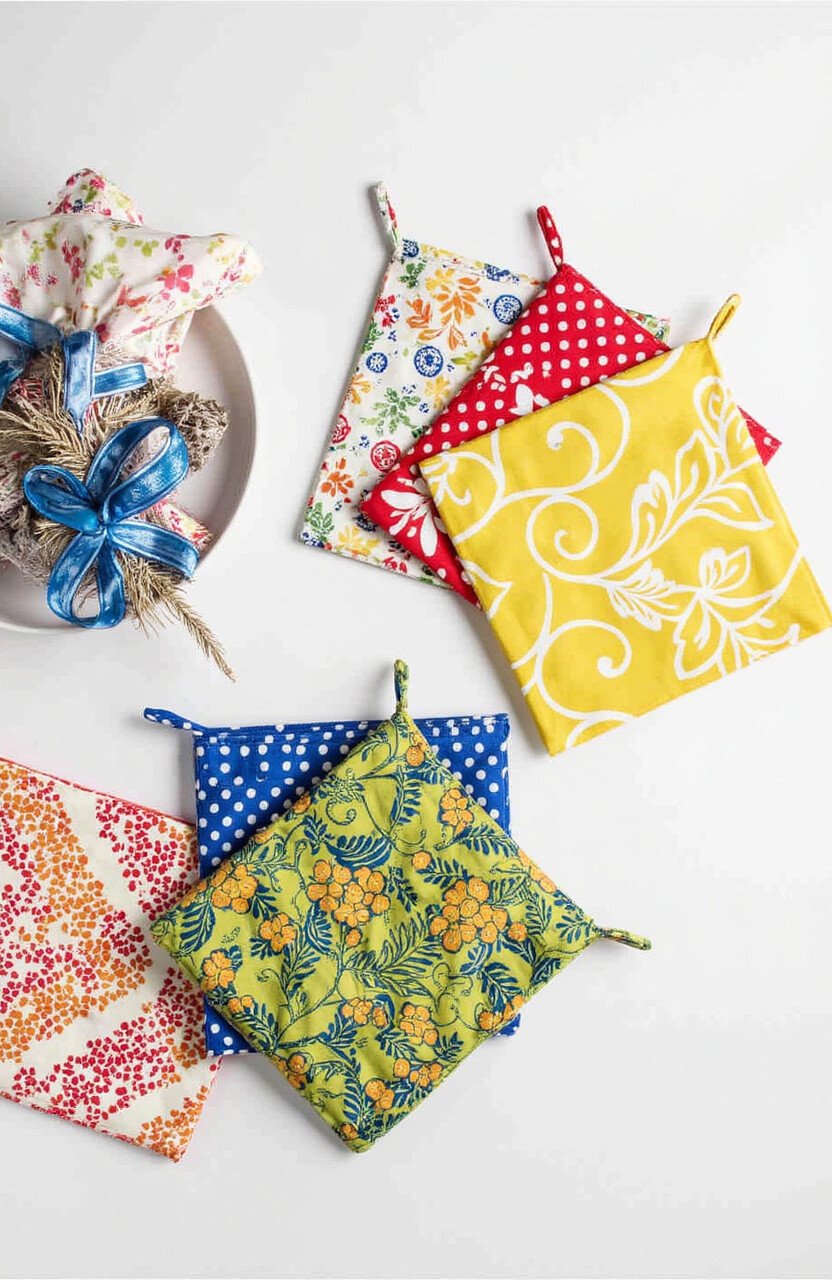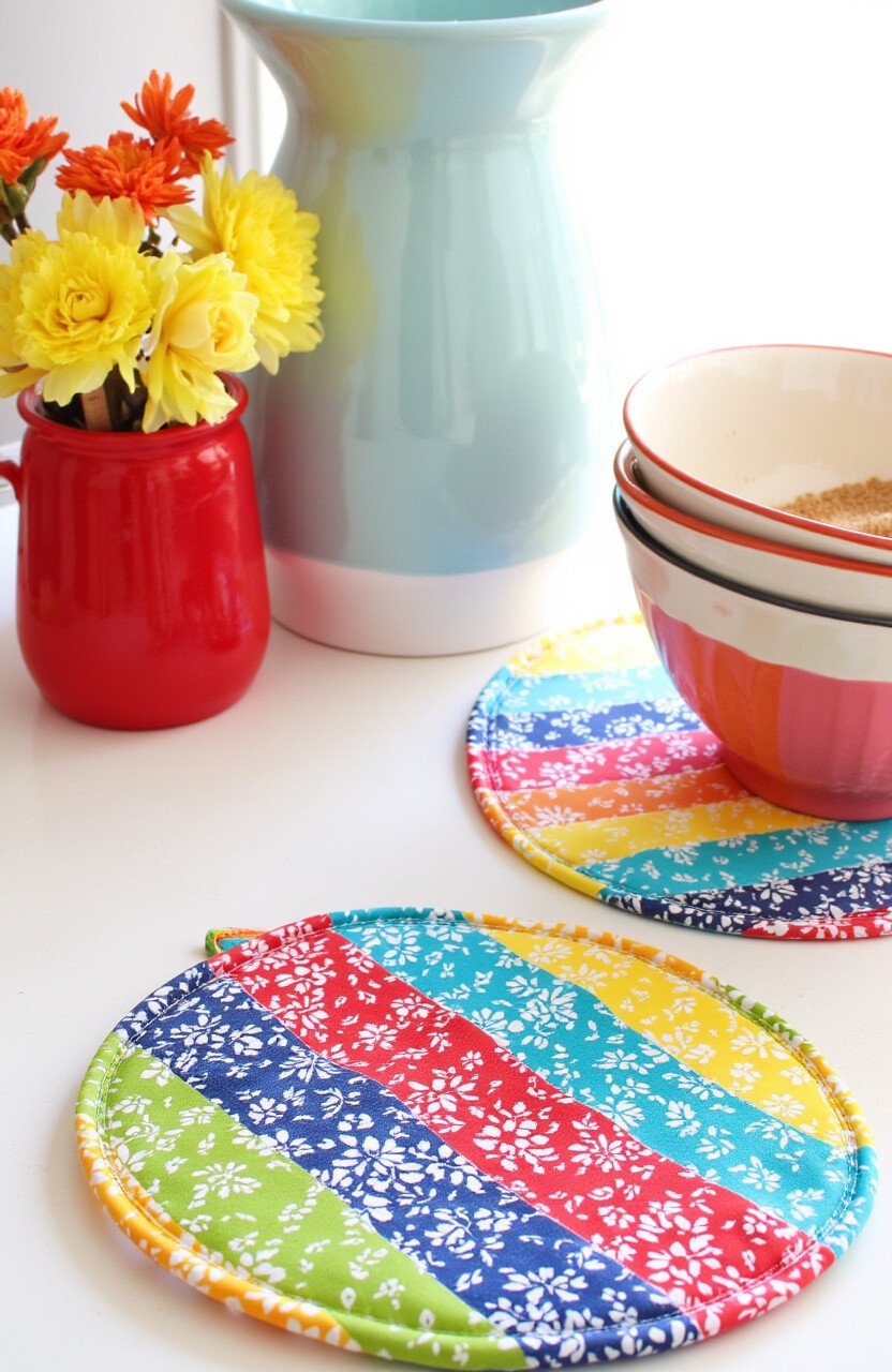 Bring a splash of color to your kitchen with these vibrant rainbow batik pads. Their bold colors and patterns brighten any space. Perfect for those who love color.