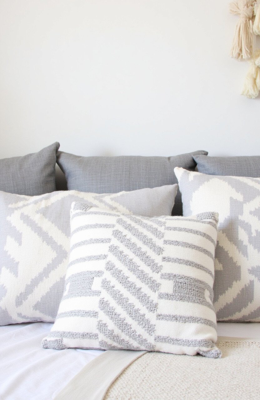 Experience the warmth of hygge with the Cozy Scandinavian Simplicity cushion. Soft grays and whites create a serene, inviting feel.