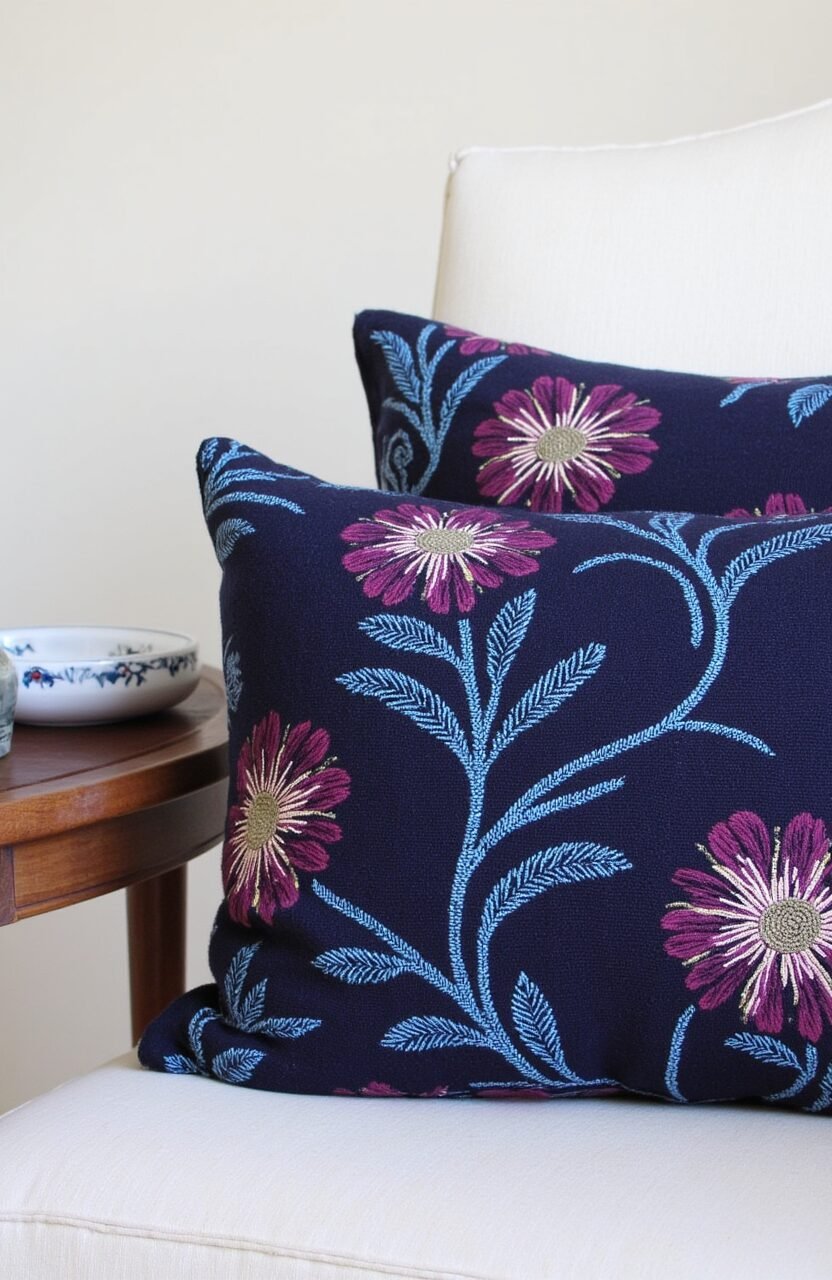The Elegant Midnight Garden cushion features deep purples and blues with floral patterns. It’s perfect for adding a touch of sophistication to your space.