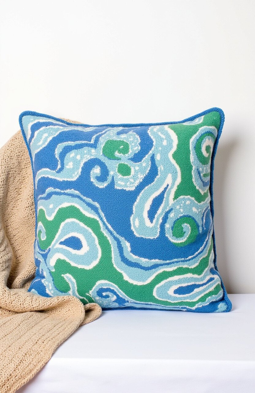 Feel the soothing rhythm of the sea with the Ocean Waves Delight cushion. Swirls of blues and greens mimic the ocean’s embrace. It’s perfect for a coastal-themed room.
