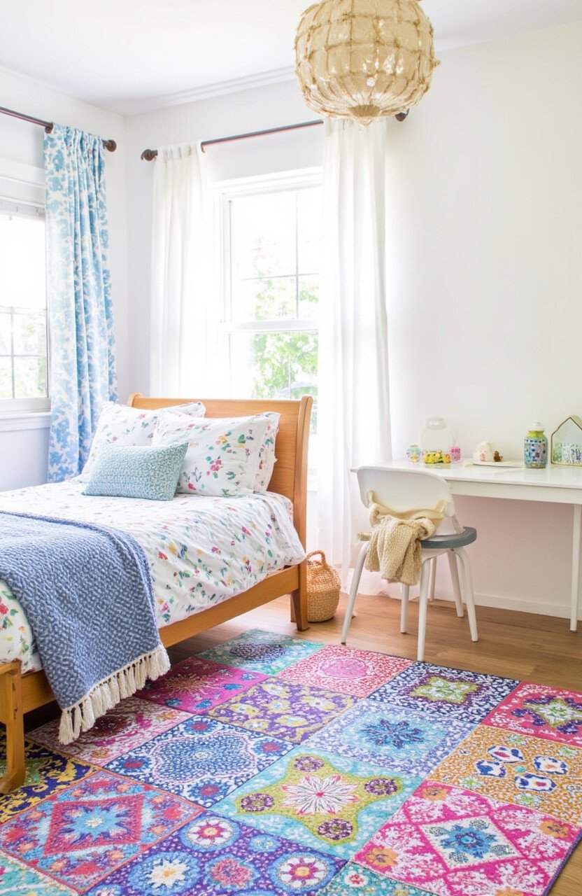 Coordinate the rug with your bedding for a cohesive look. Mixing patterns can add a playful touch, too.