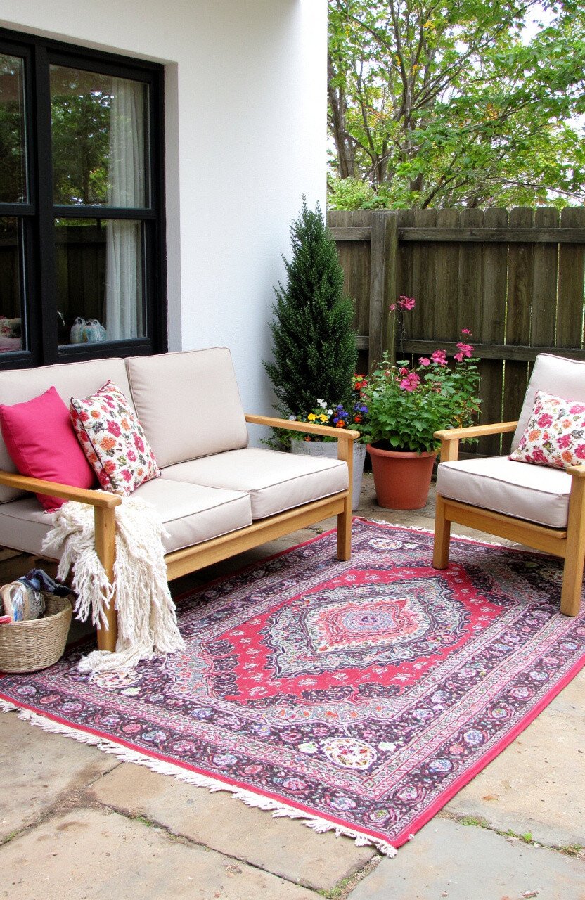 Choose rugs made of durable materials that can withstand the elements. The vibrant designs can elevate any outdoor gathering.