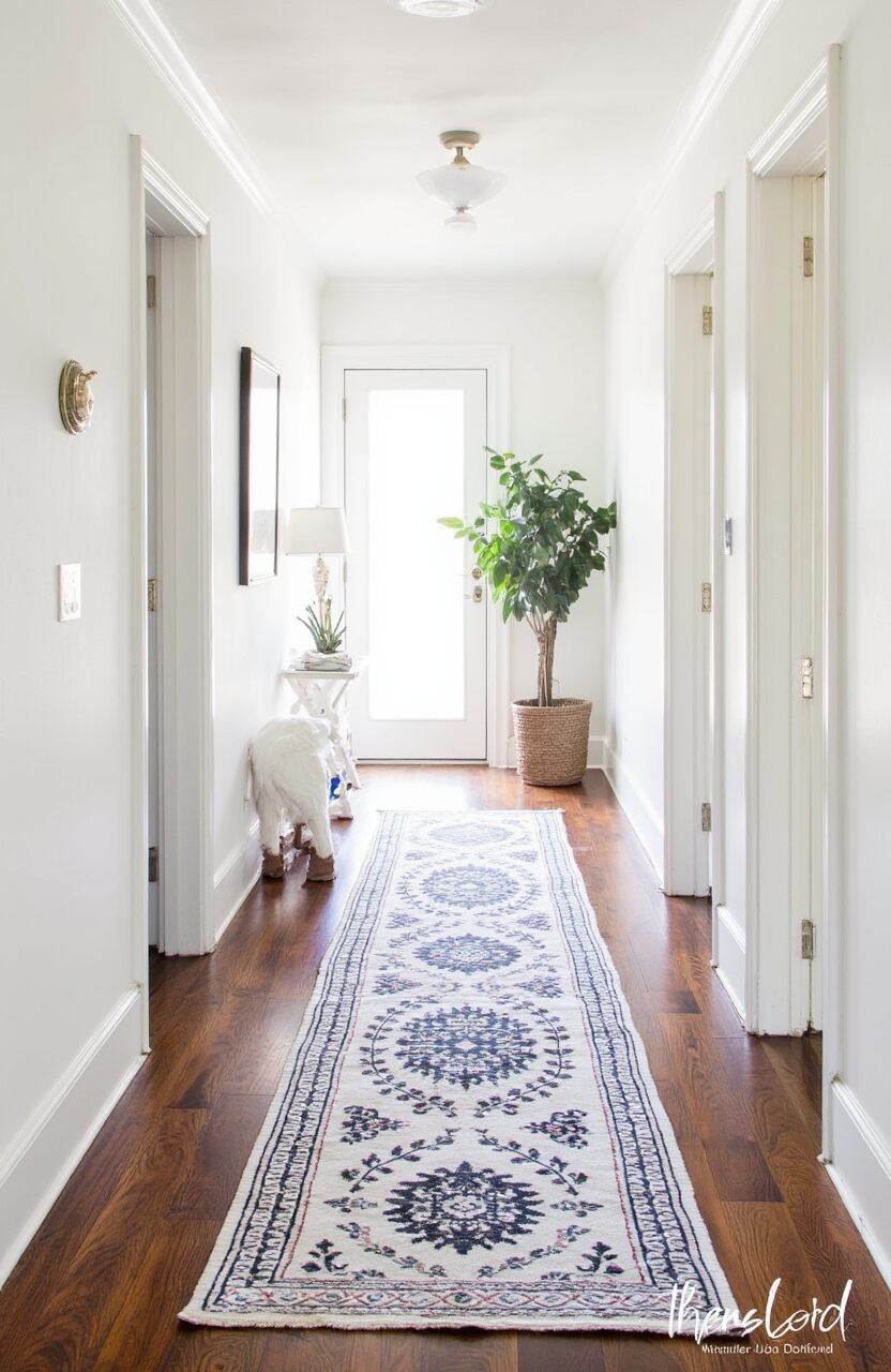 Measure your hallway and choose a rug that leaves a bit of flooring on each side. It frames the rug perfectly.