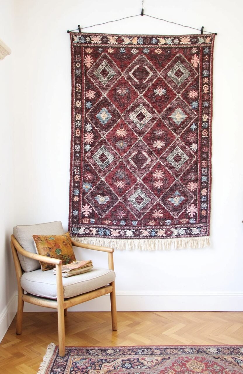 Mounting a rug on the wall can be a weekend project. Use a rod or clips, and you’ve got yourself an instant gallery wall.