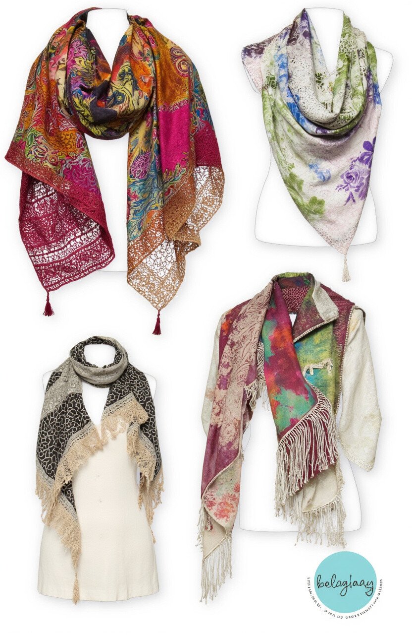 Scarves with batik lace appliqué are a fashionable accessory for any outfit. The lightness of lace combined with colorful batik makes for an elegant piece. These scarves are perfect for adding a touch of sophistication to your look.