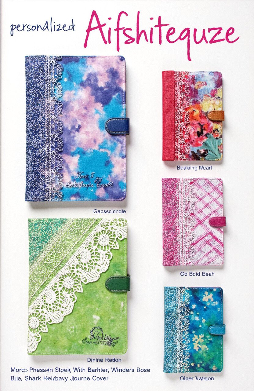 Journal covers with batik lace appliqué make writing feel special. The combination of textures and colors makes these covers unique. They’re perfect for personalizing your writing experience.