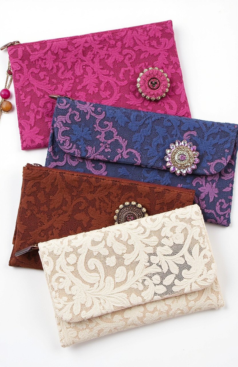 Clutch purses with batik lace appliqué are a chic accessory for any outfit. The delicate lace and bold colors create a statement piece. These clutches are perfect for a night out or a special occasion.