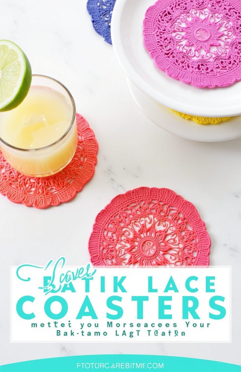 Protect your surfaces with coasters made from batik lace doilies. These coasters are beautiful and functional. They prevent stains while adding charm.