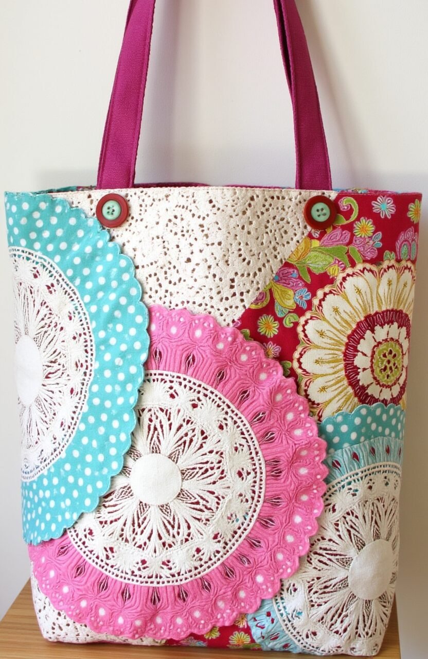 Create a unique tote bag using batik lace doilies. It’s a stylish accessory for shopping or a day out. This bag is both practical and pretty.