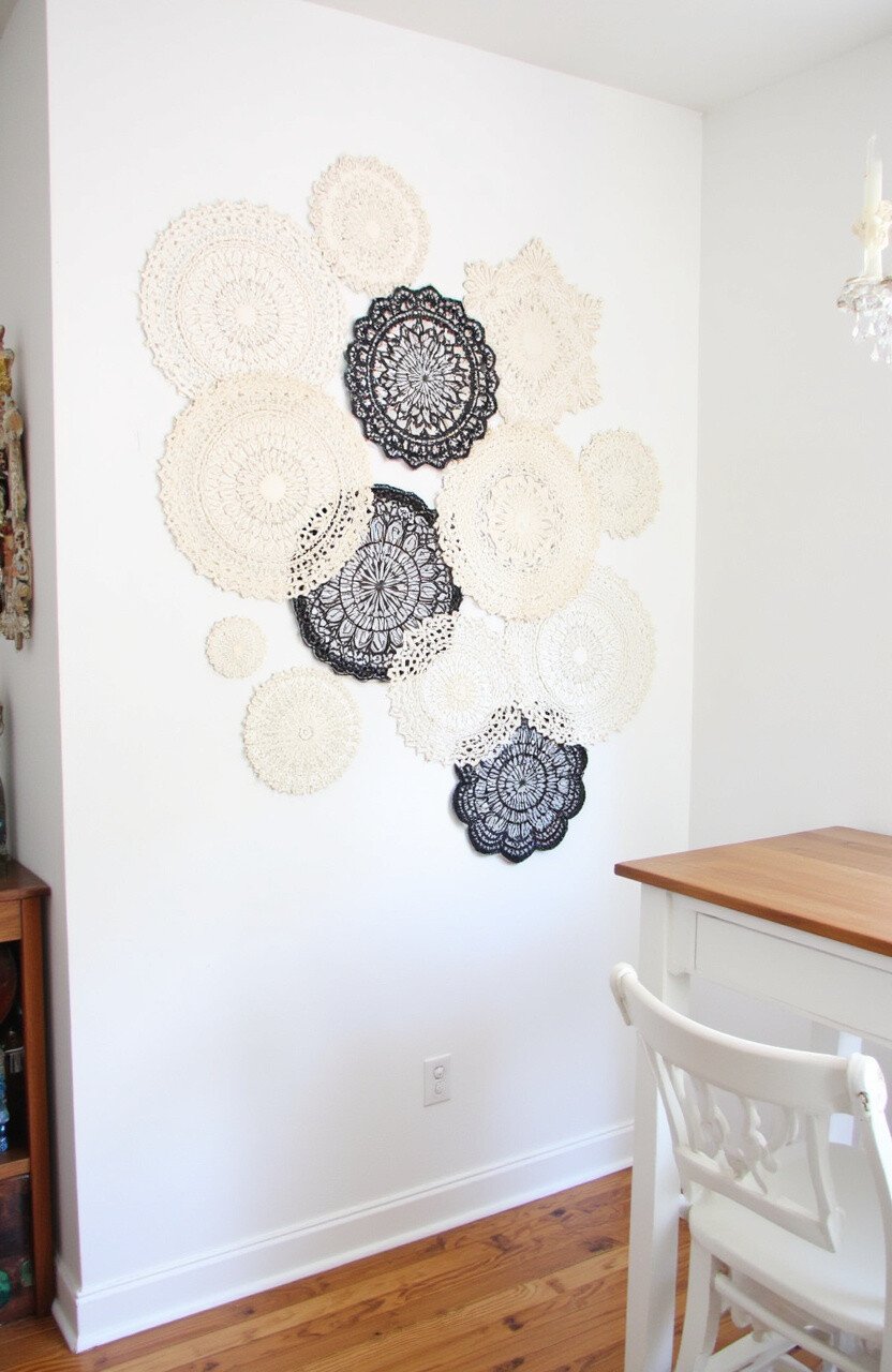 The intricate designs of the doilies add texture and depth. They can be framed or hung directly on the wall. This idea is perfect for living rooms or hallways.