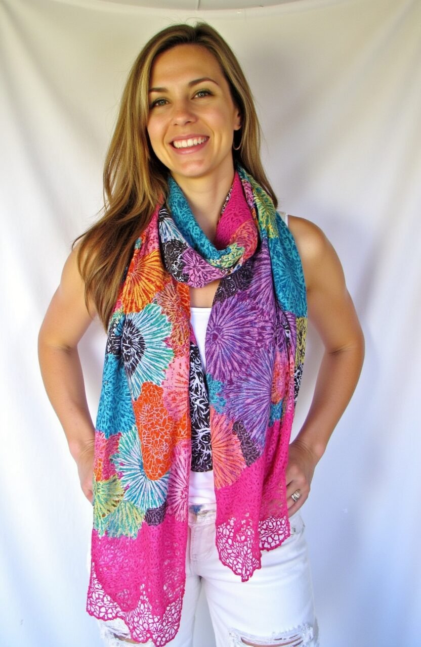 Wrap yourself in style with a scarf made from batik lace doilies. This accessory is lightweight and perfect for any season. It adds a pop of color to any outfit.