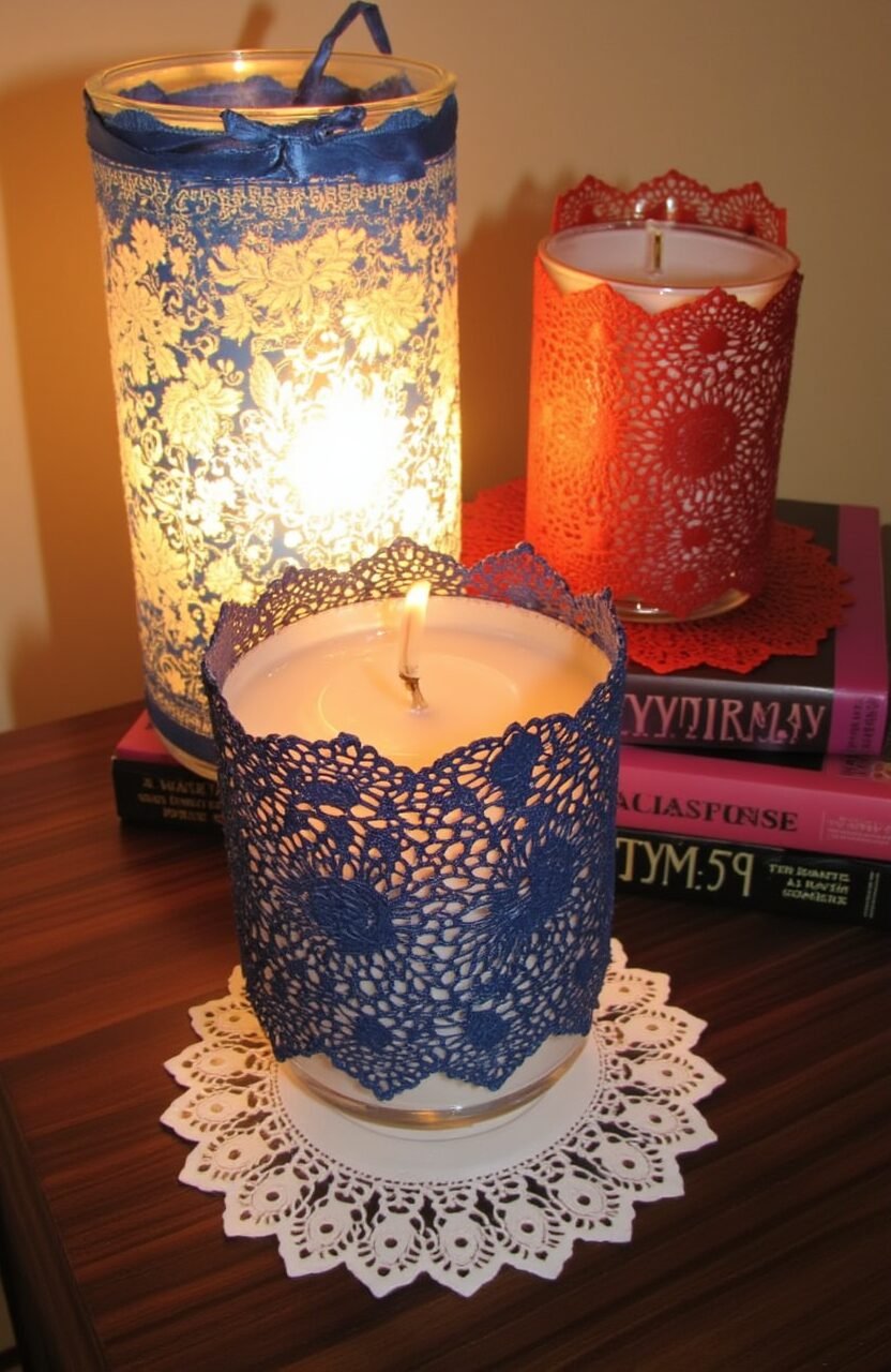 Wrap batik lace doilies around candle holders for a warm glow. The patterns create beautiful shadows. This idea is perfect for cozy evenings.
