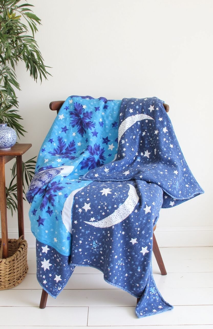 The Blue Ocean Waves throw is like capturing the sea’s beauty in fabric. Its swirling blue patterns are soothing and perfect for a calming atmosphere. Imagine draping it over your couch for a serene touch.