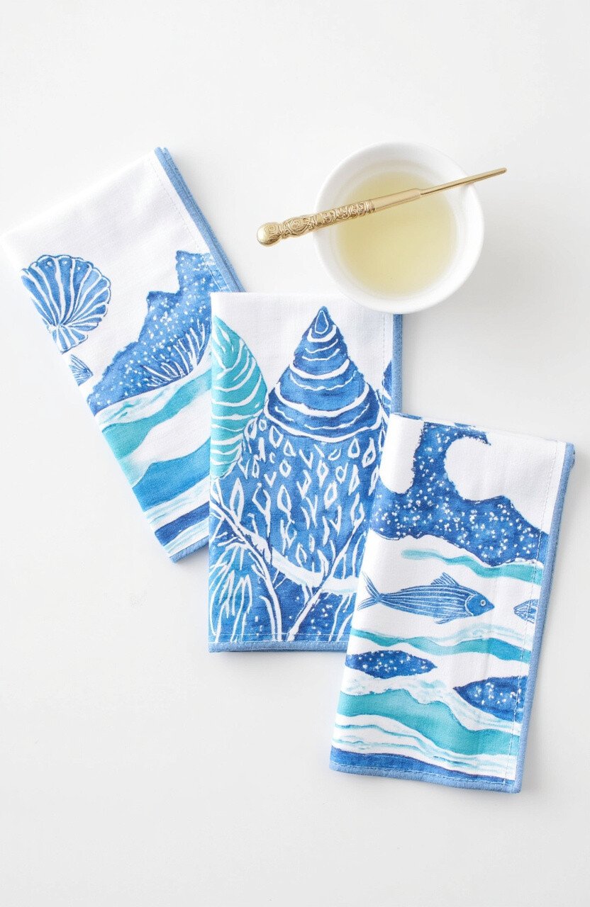Dive into the deep blue with napkins that feature fish, shells, and waves. The calming blues and whites create a serene dining atmosphere.