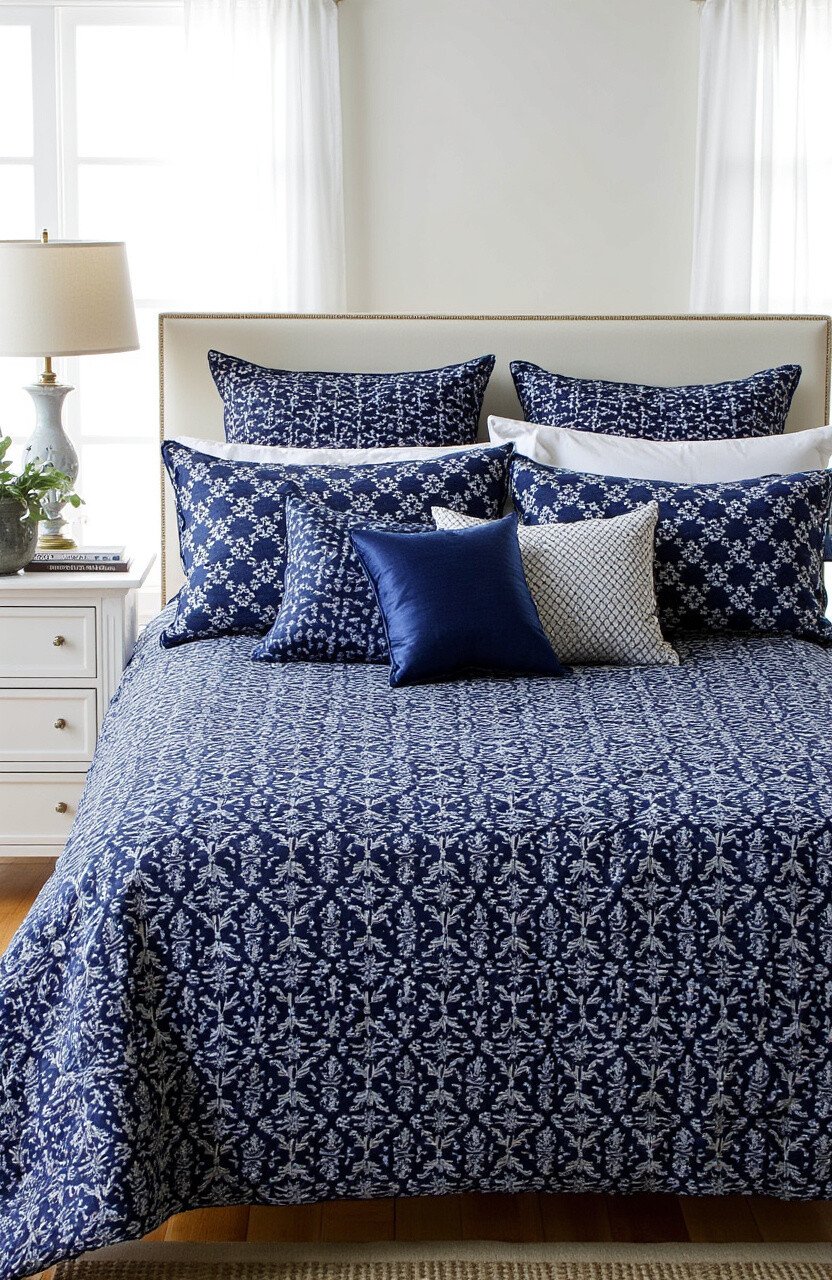There’s something about deep indigo that feels both regal and soothing. This bedding collection features rich, dark tones interwoven with white, intricate batik designs. It’s ideal for creating a sophisticated yet cozy atmosphere.