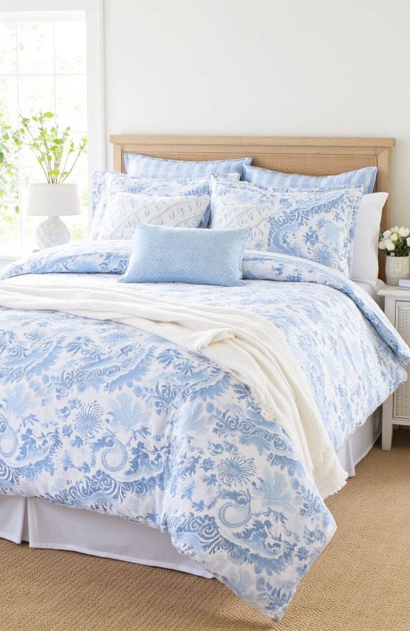 Besides its beautiful design, this set offers a calming effect, promoting better sleep. Pair it with wicker furniture or driftwood accents to enhance the coastal vibe. It’s an affordable way to bring the beach to your bedroom without the travel cost.