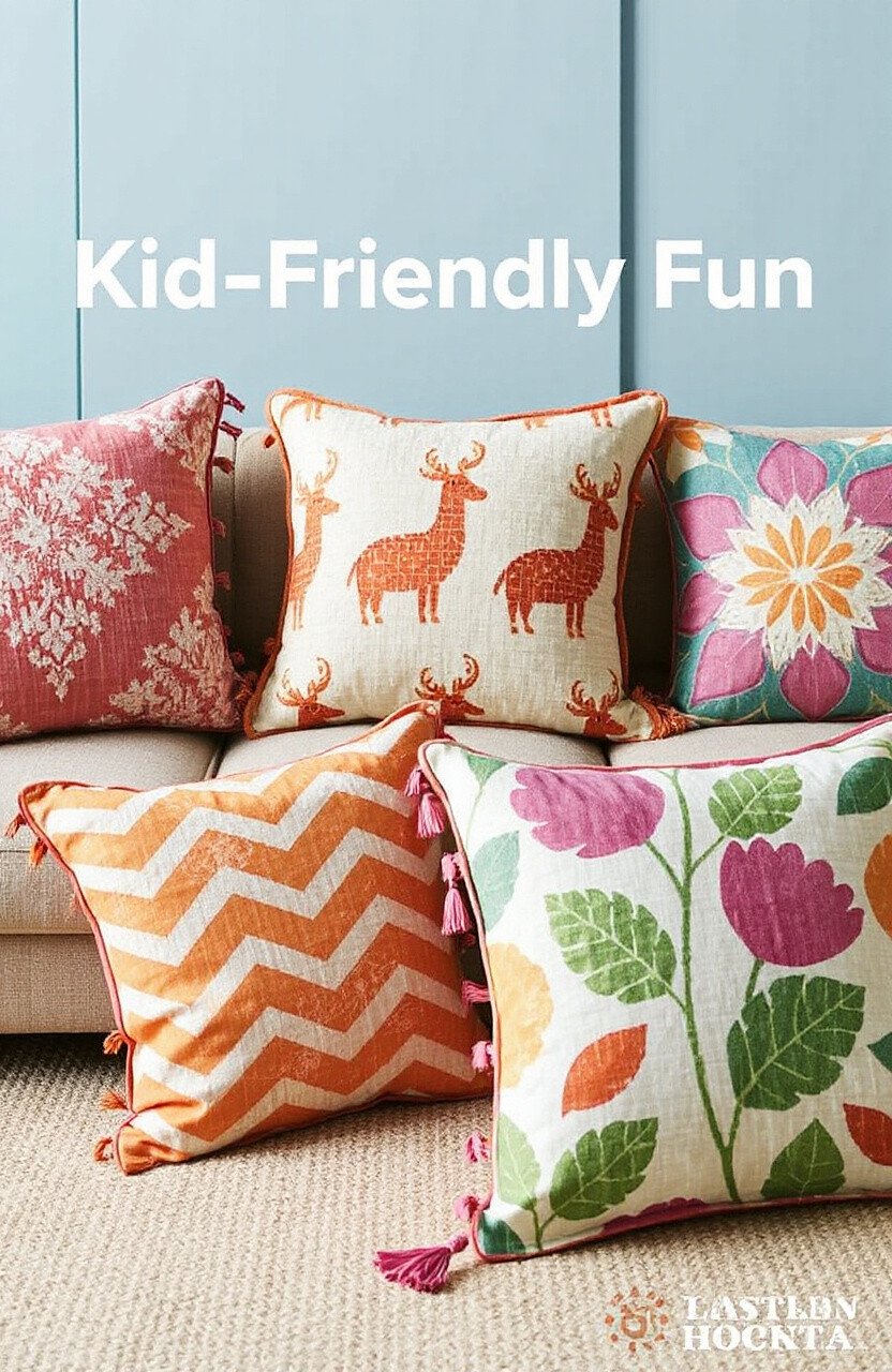 Kid-friendly pillows are perfect for playrooms or children’s bedrooms, adding joy and whimsy.