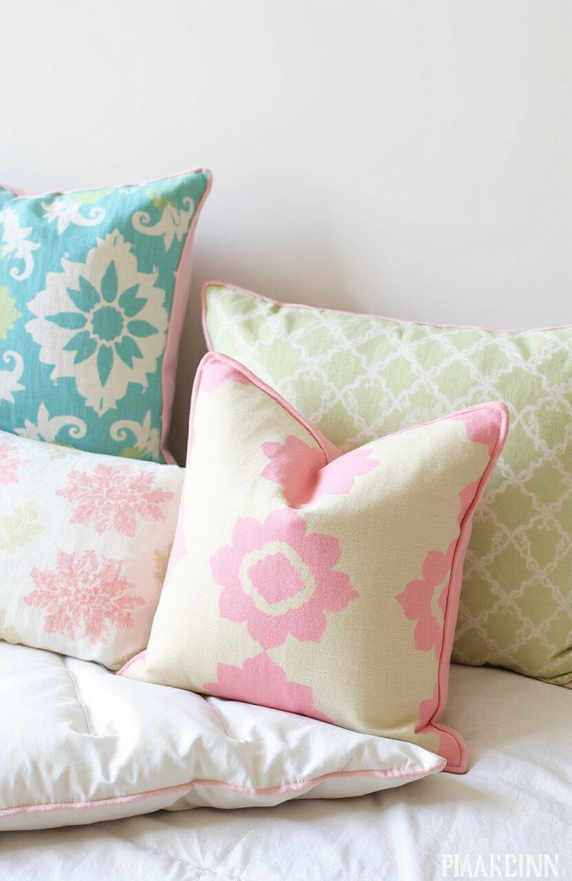 Pastel pillows create a dreamy, serene atmosphere, ideal for bedrooms or nurseries.