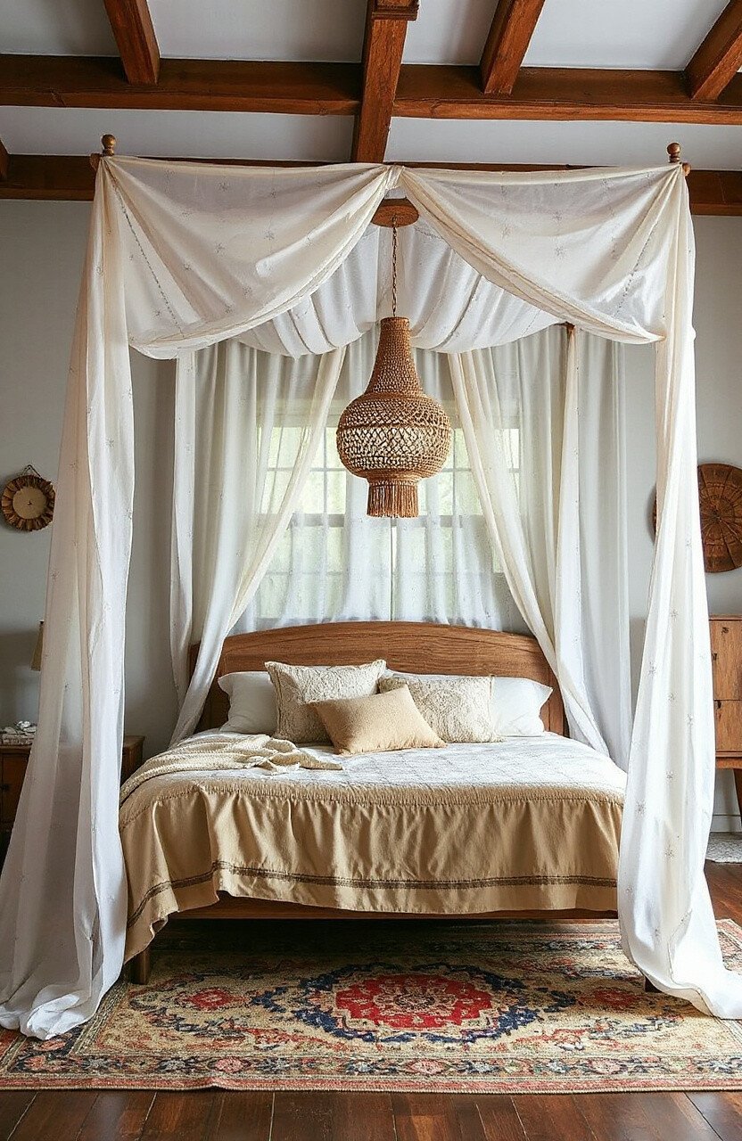 Opt for light materials that flow elegantly around your bed, perfect for a peaceful night’s sleep. It’s like sleeping in an art gallery!