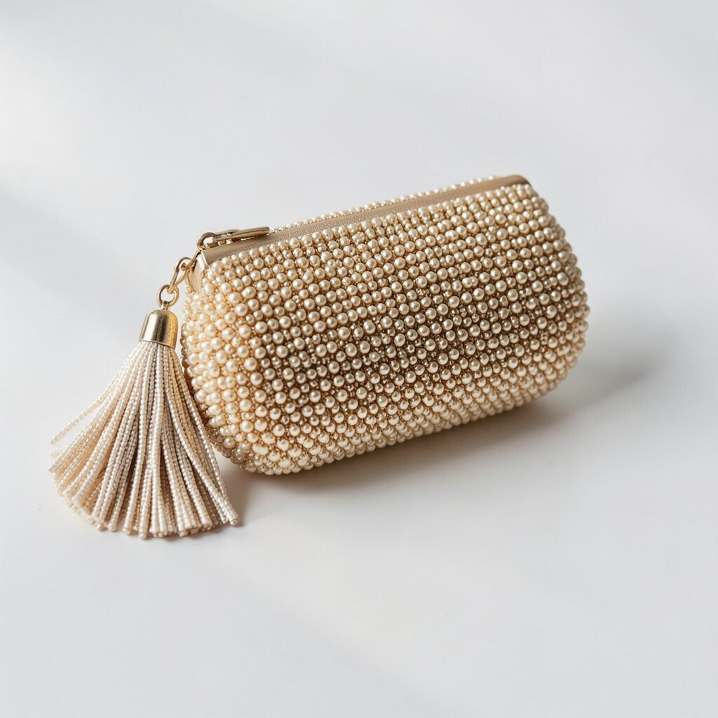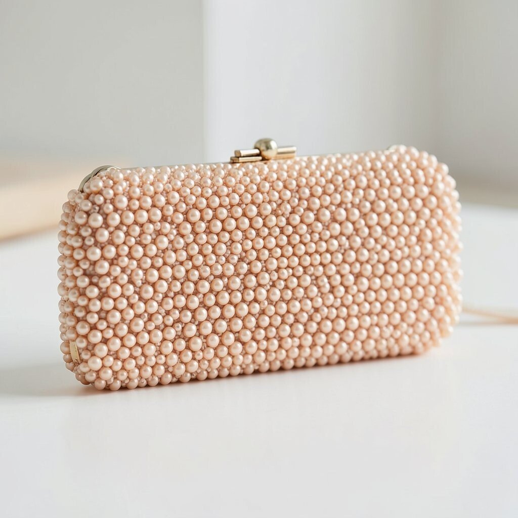 A nude beaded clutch has a soft, clean look that goes with almost anything. It feels calm, neat, and easy to wear.