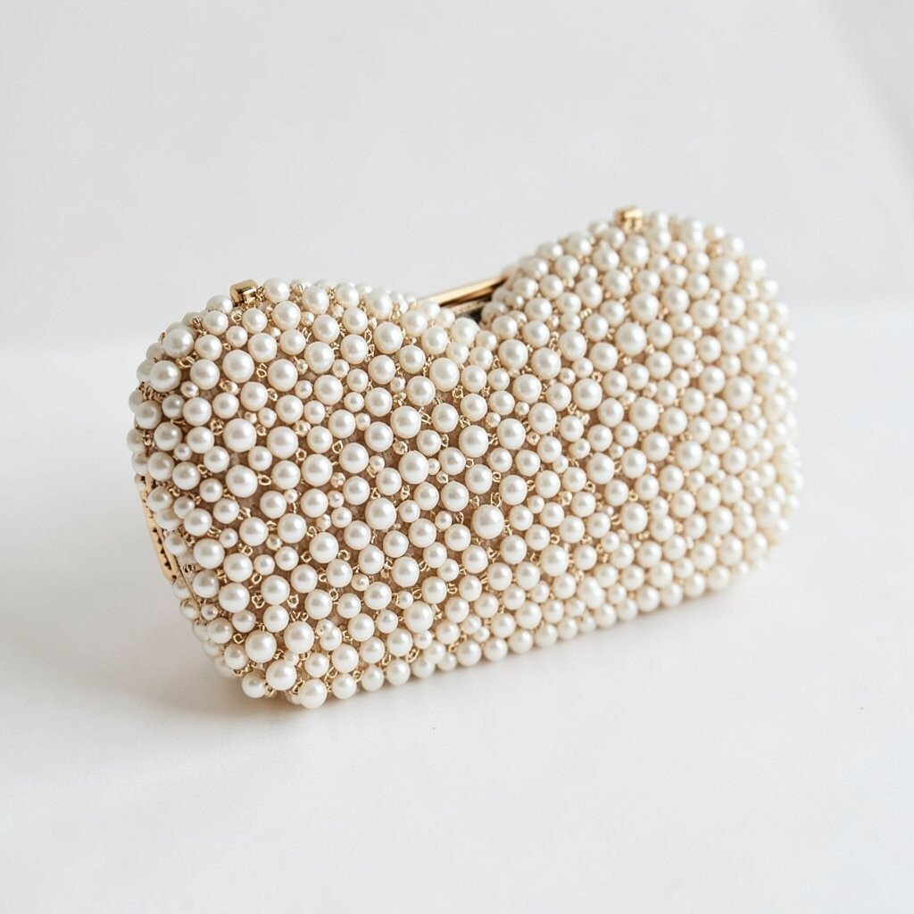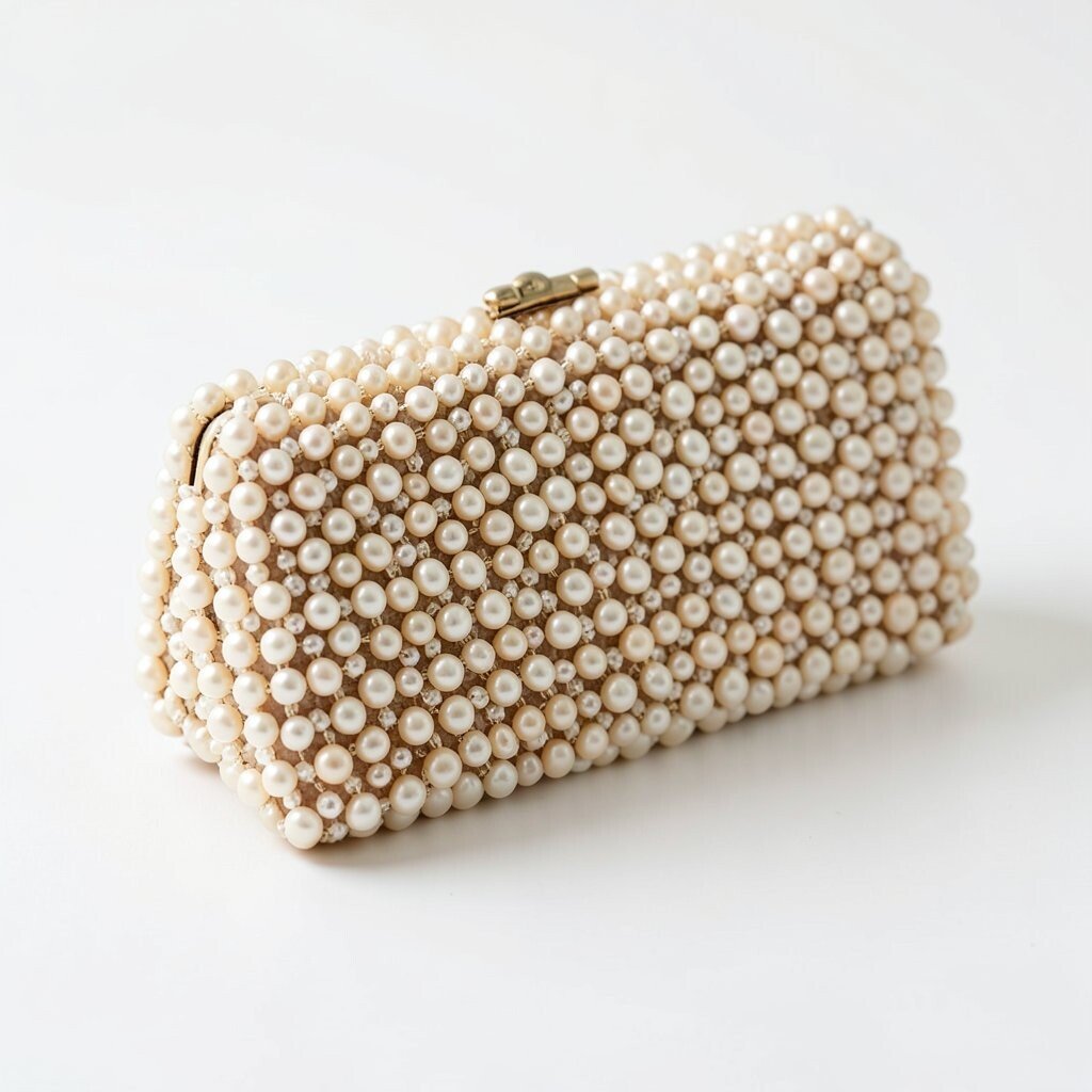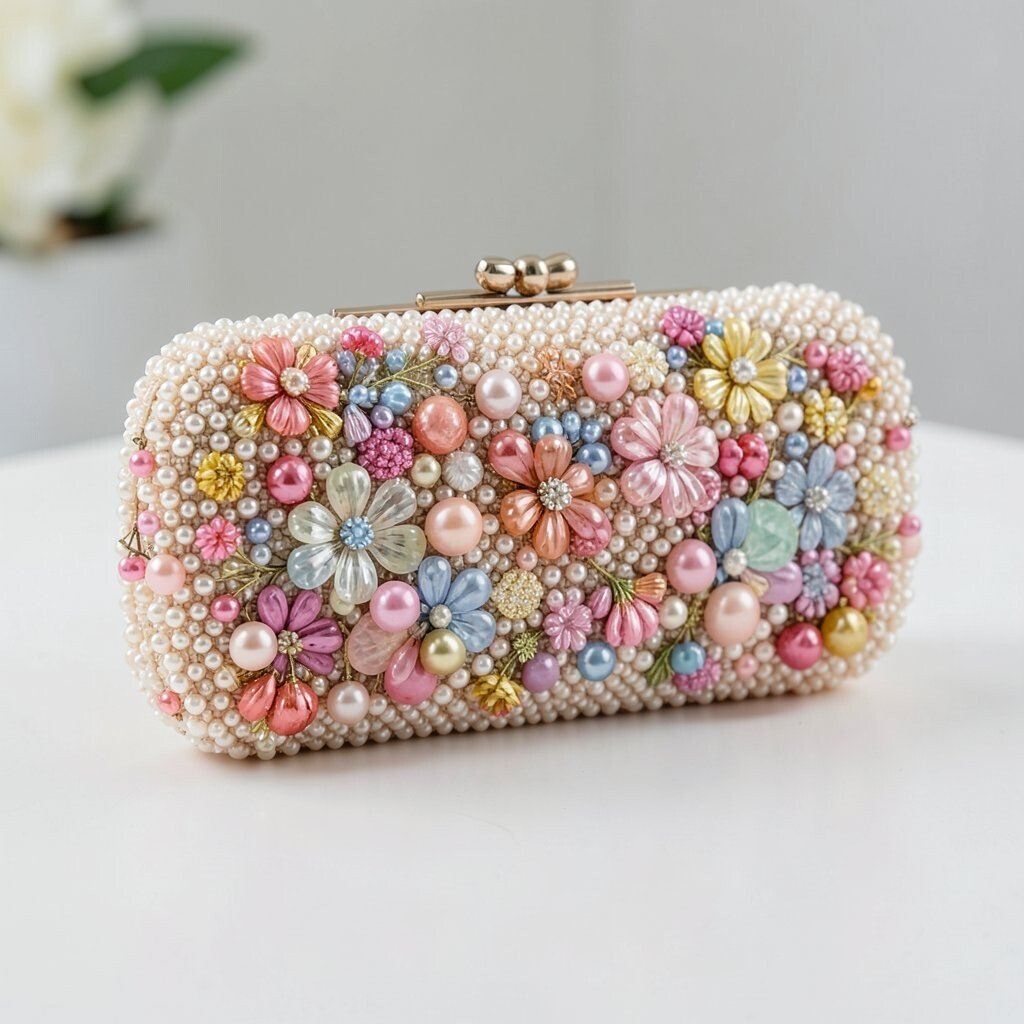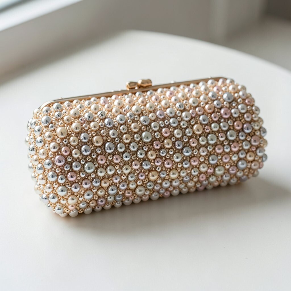 A beaded clutch with a pearl handle looks soft, sweet, and very elegant. The handle adds a fancy touch that feels neat and graceful.