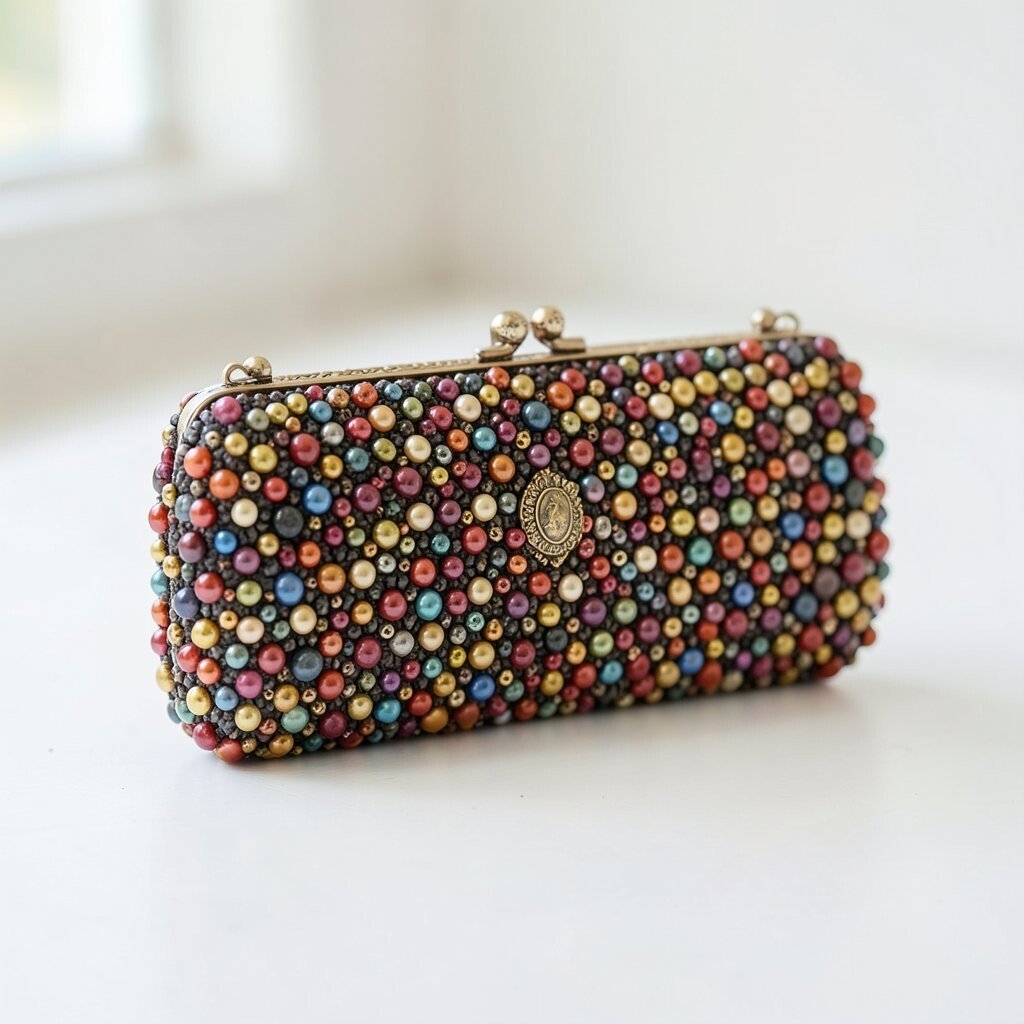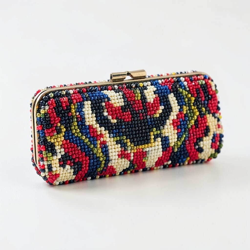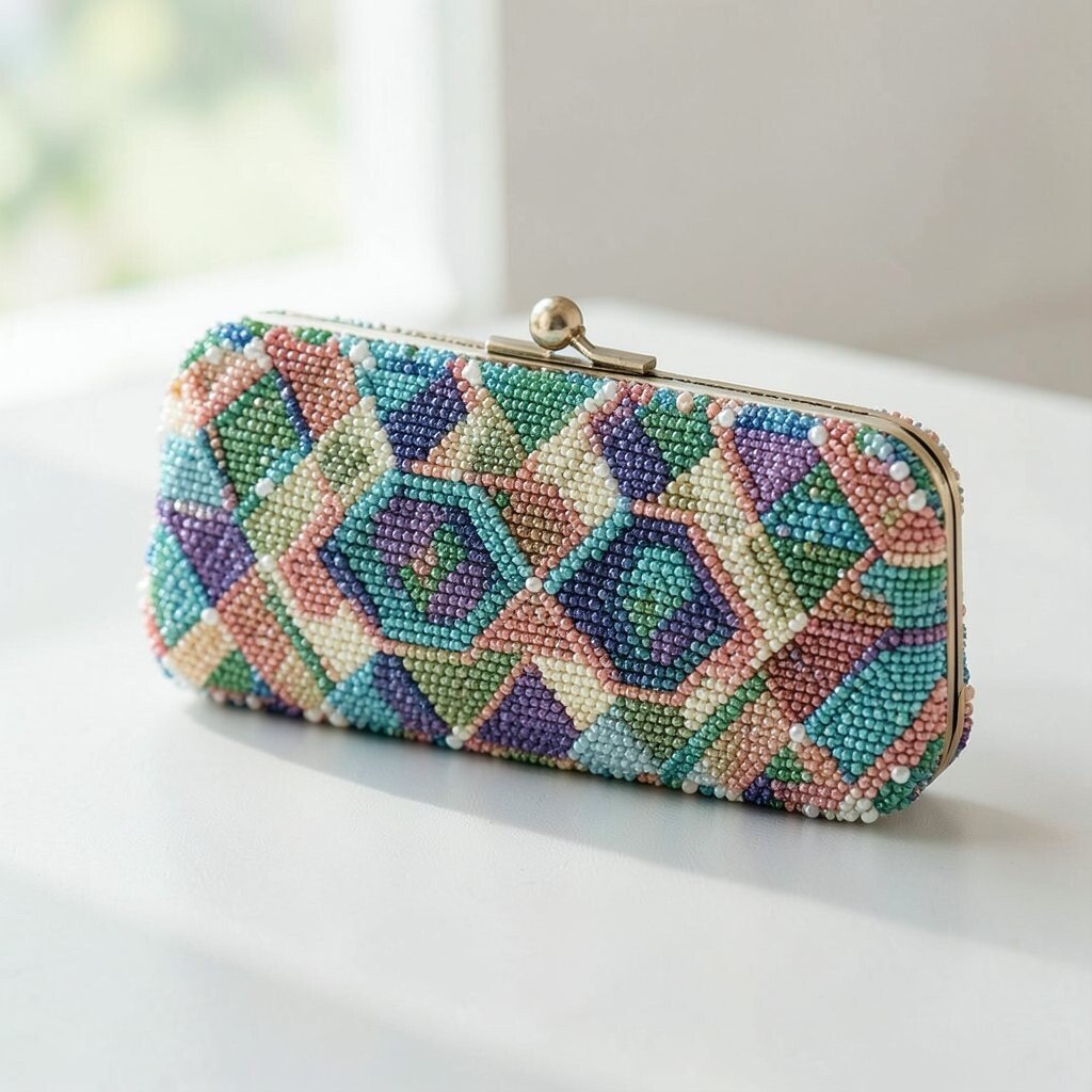 A geometric beaded clutch has sharp lines, cool shapes, and a modern feel. It often looks like a tiny art piece in your hand.