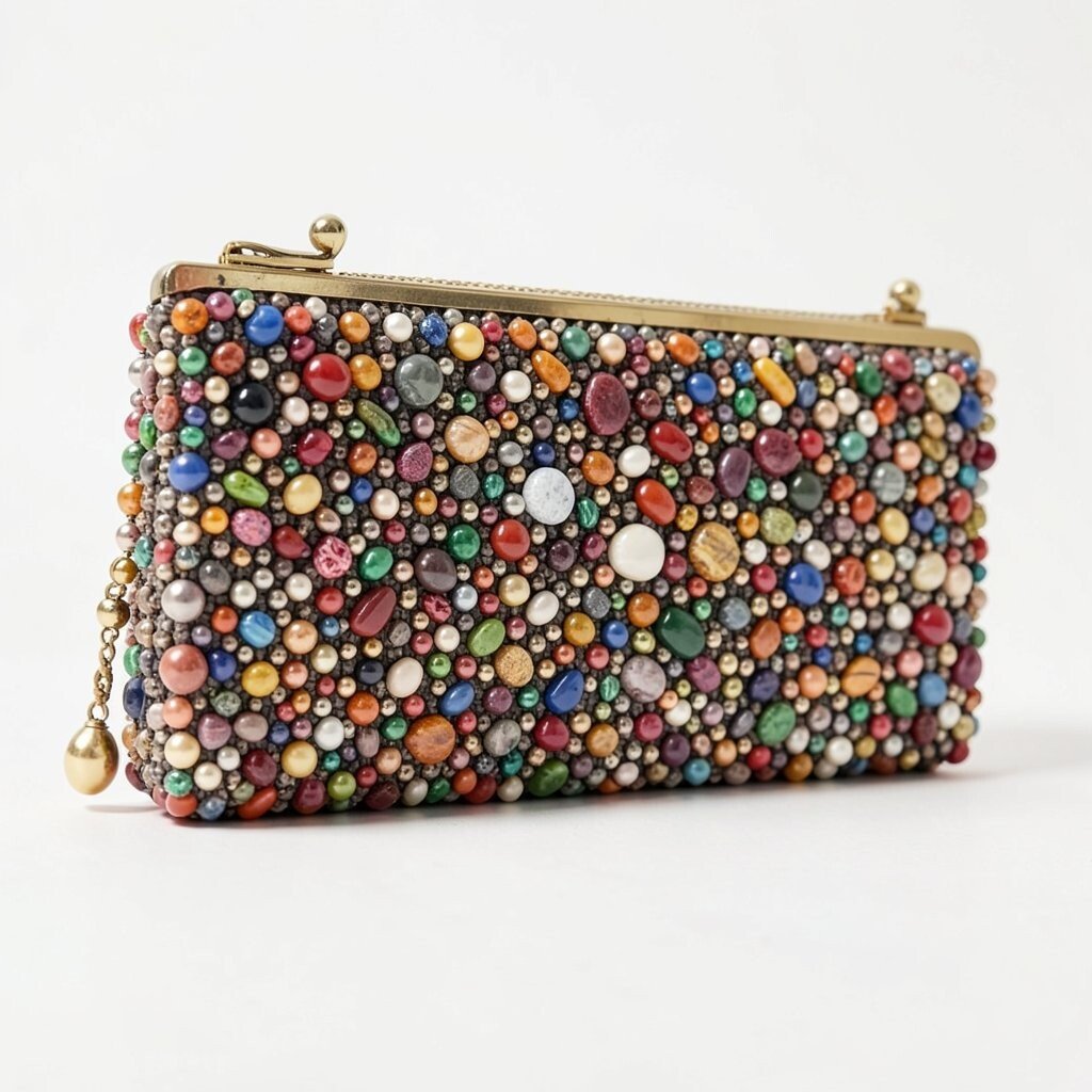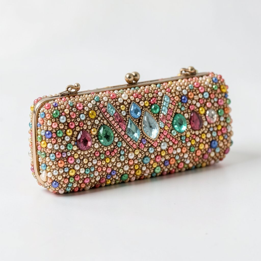 An Art Deco beaded clutch often has bold lines, fan shapes, and rich shine. It feels fancy in a classic old-Hollywood way.