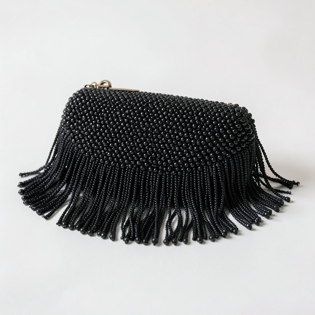 A black beaded clutch with fringe looks sleek and a little mysterious. The fringe gives it movement, so it feels lively when you walk.