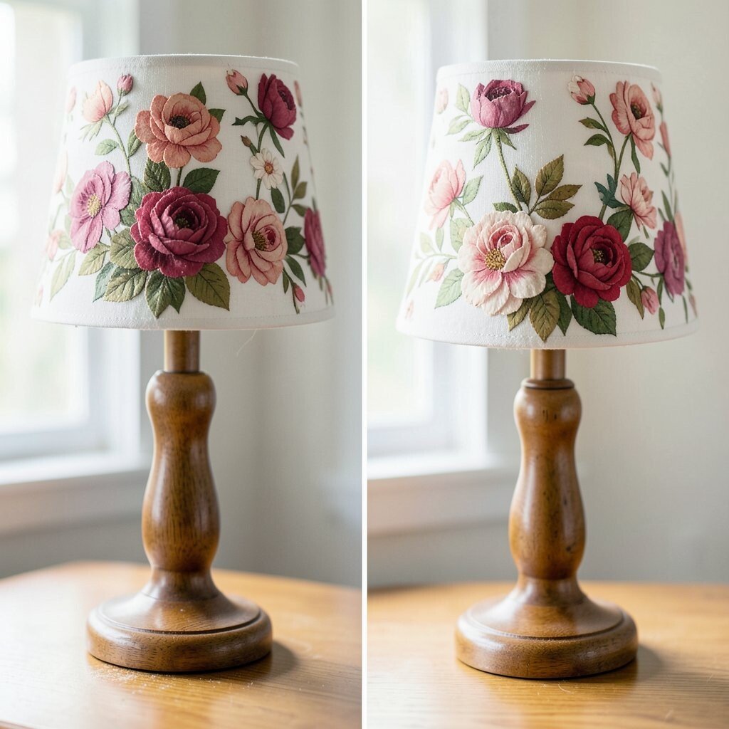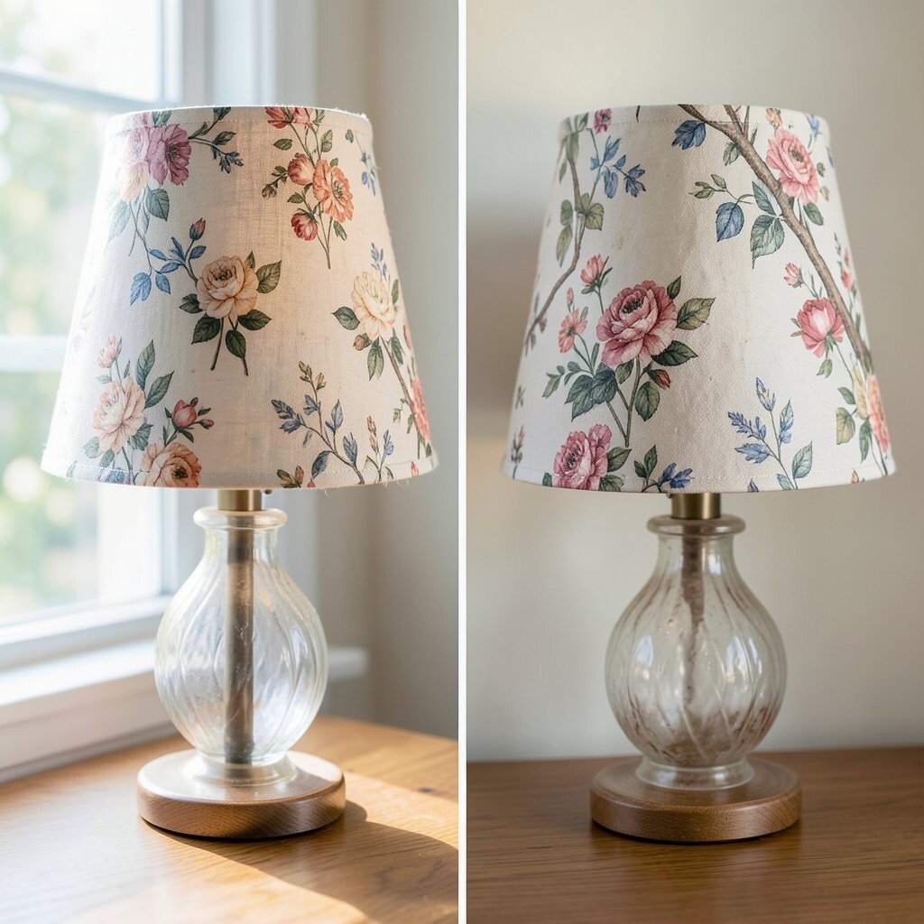 Give your lampshade a new life with floral fabric. The light will beautifully glow through the material, creating a soft ambiance.
