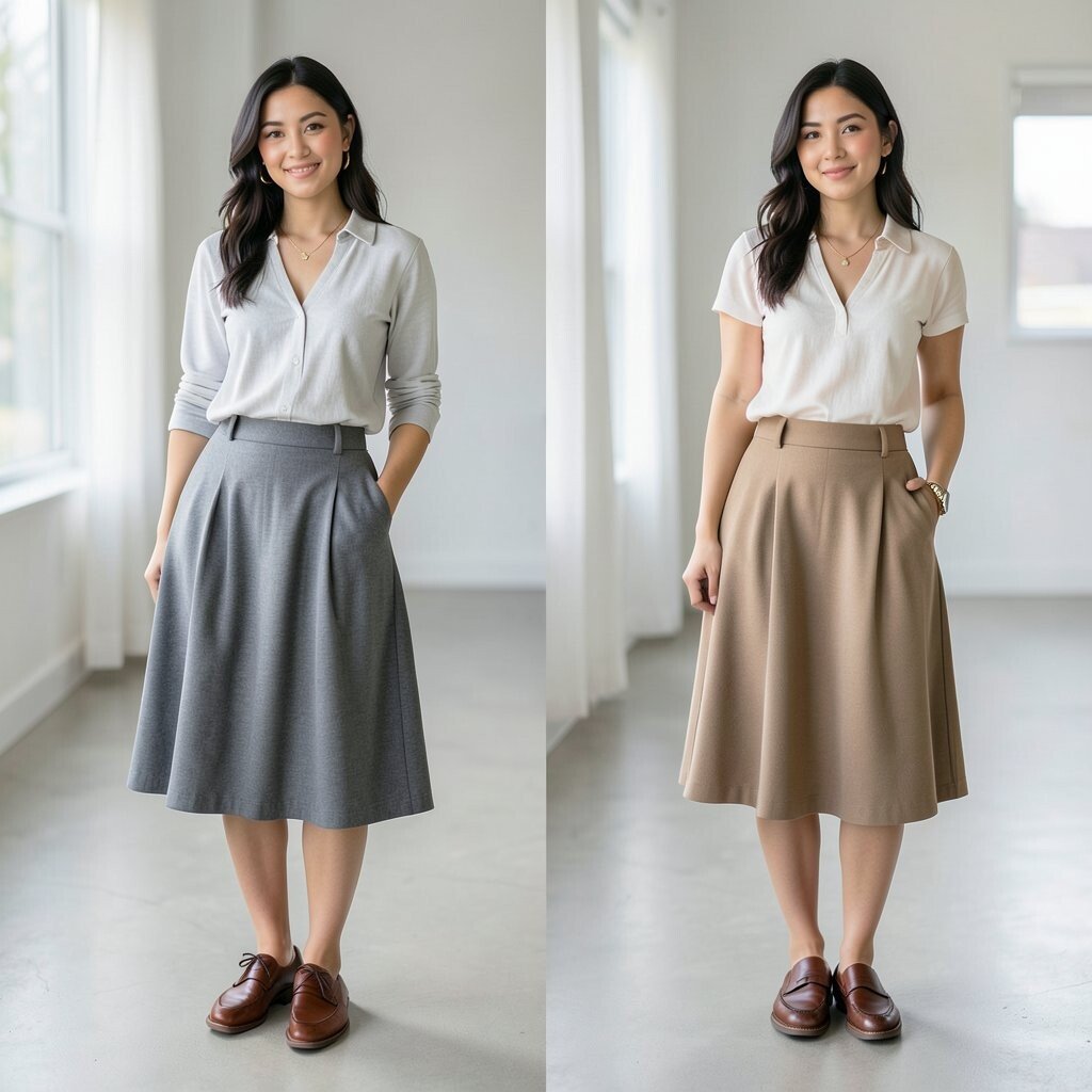 Try pleats for movement or a straight skirt for a cleaner line. A tucked sweater or fitted top helps the outfit feel balanced and ready for the day.