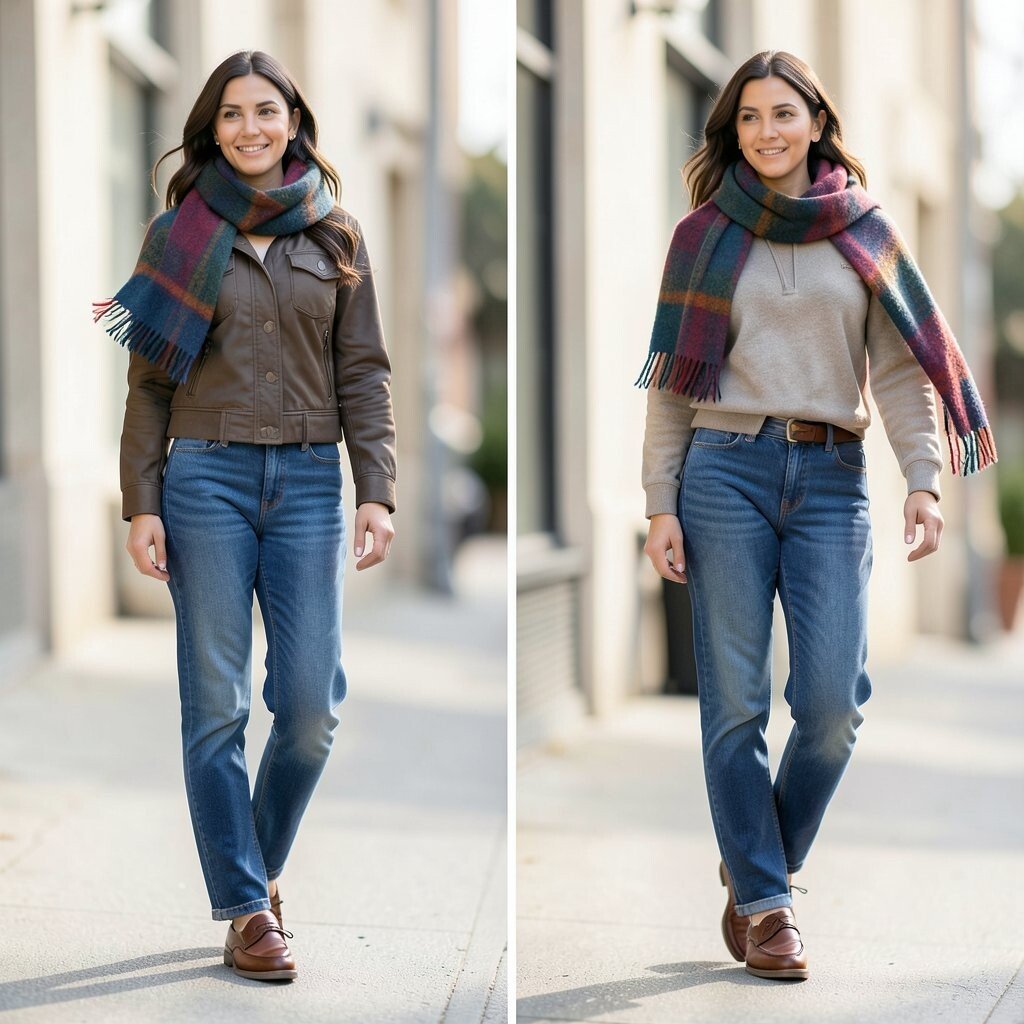 A simple top and loafers can feel flat without a little extra life. A scarf adds motion, color, and a soft frame around the face or neck.