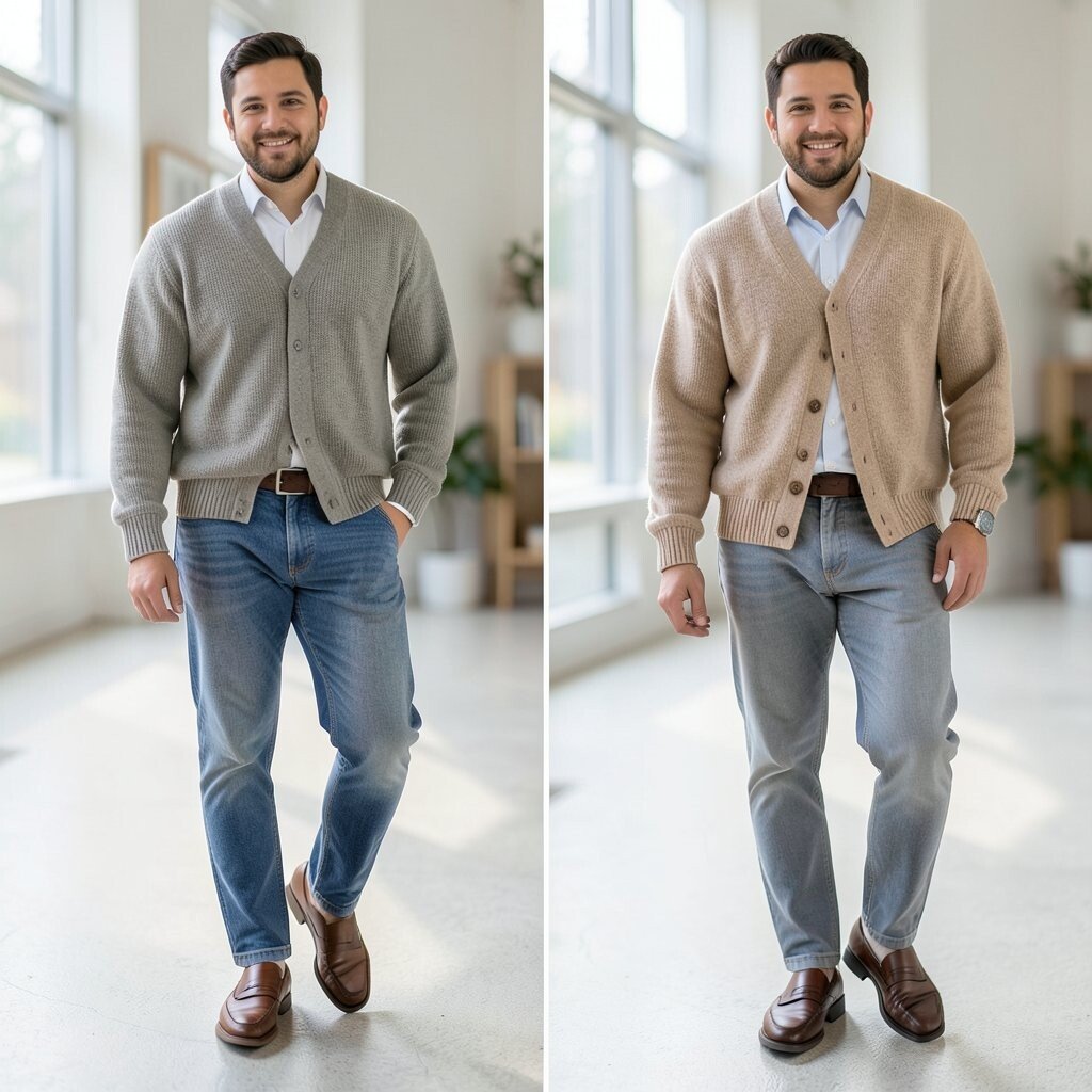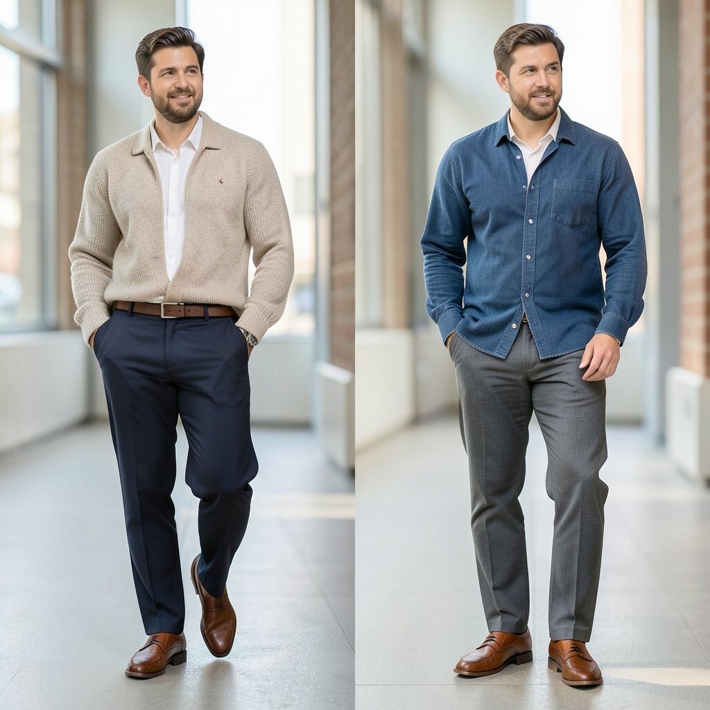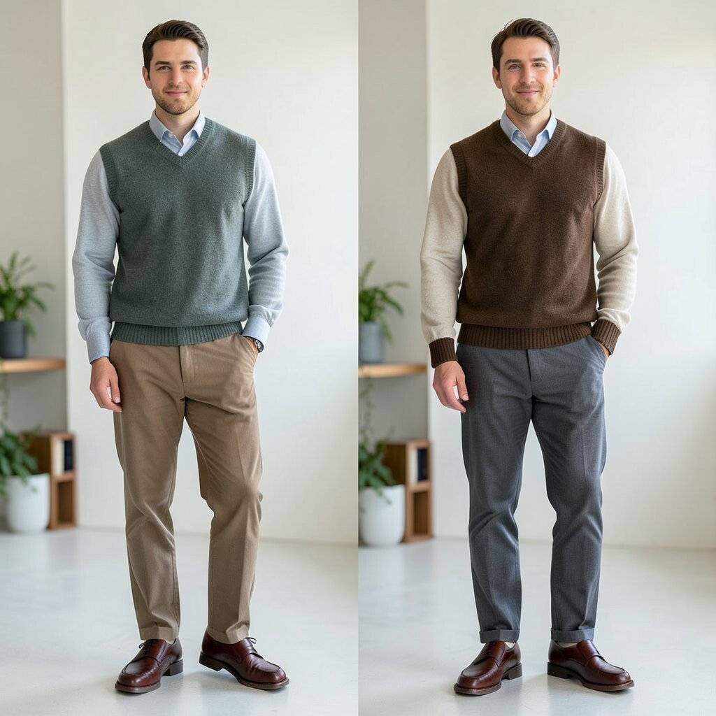 The before outfit may feel plain and flat. The after version adds a sweater vest, which brings texture, charm, and a little smart-casual style to loafers.
