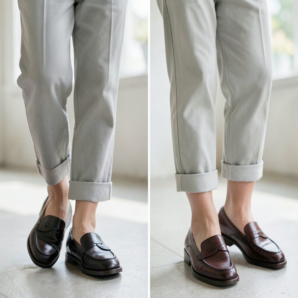 Long hems can hide loafers and make the outfit feel heavy at the bottom. A rolled hem shows a little ankle or sock and brings more attention to the shoe.