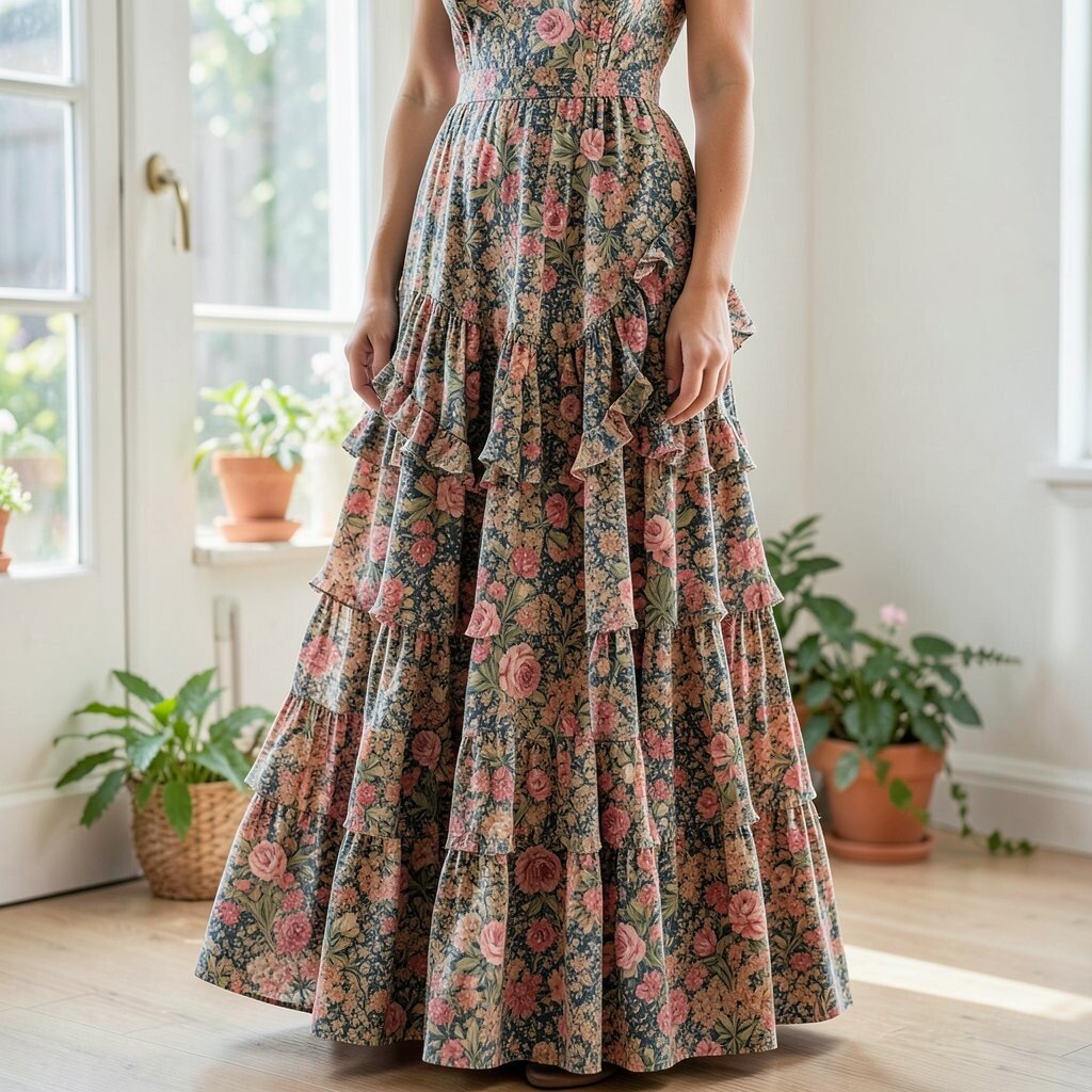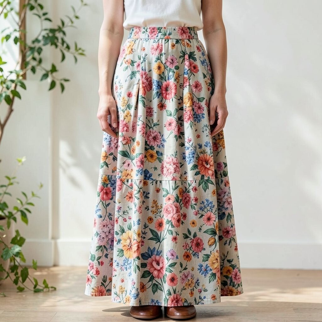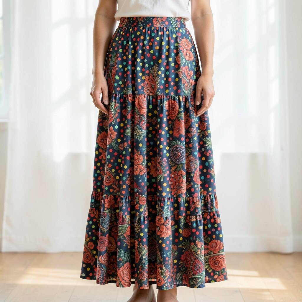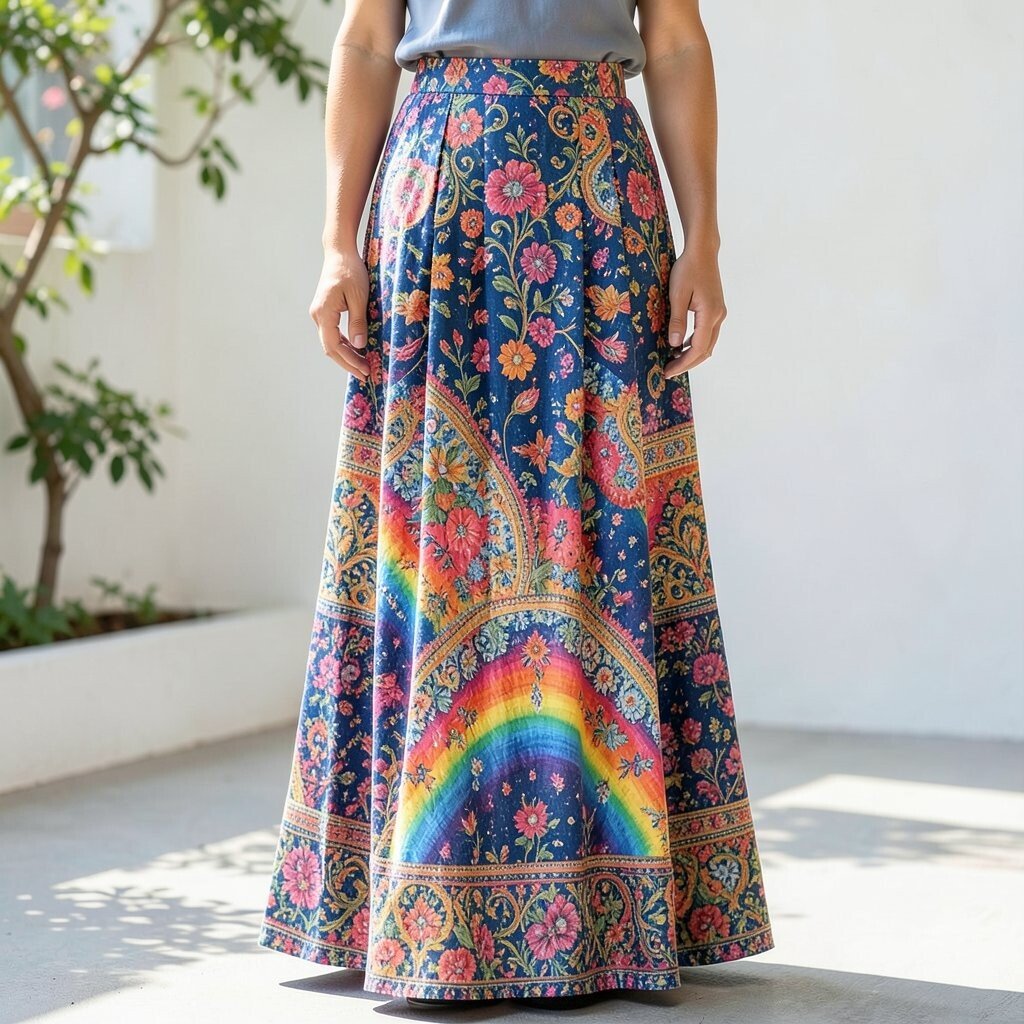 Floral Dream A lush garden comes alive on this maxi skirt, with vibrant floral patterns dancing across the fabric. The colors are bold yet soothing, perfect for those who love nature’s palette.