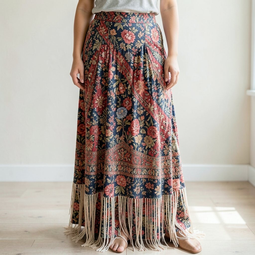 Boho Fringe Fringe detailing adds a playful, whimsical touch to any maxi skirt. It’s all about movement and fun with this style.